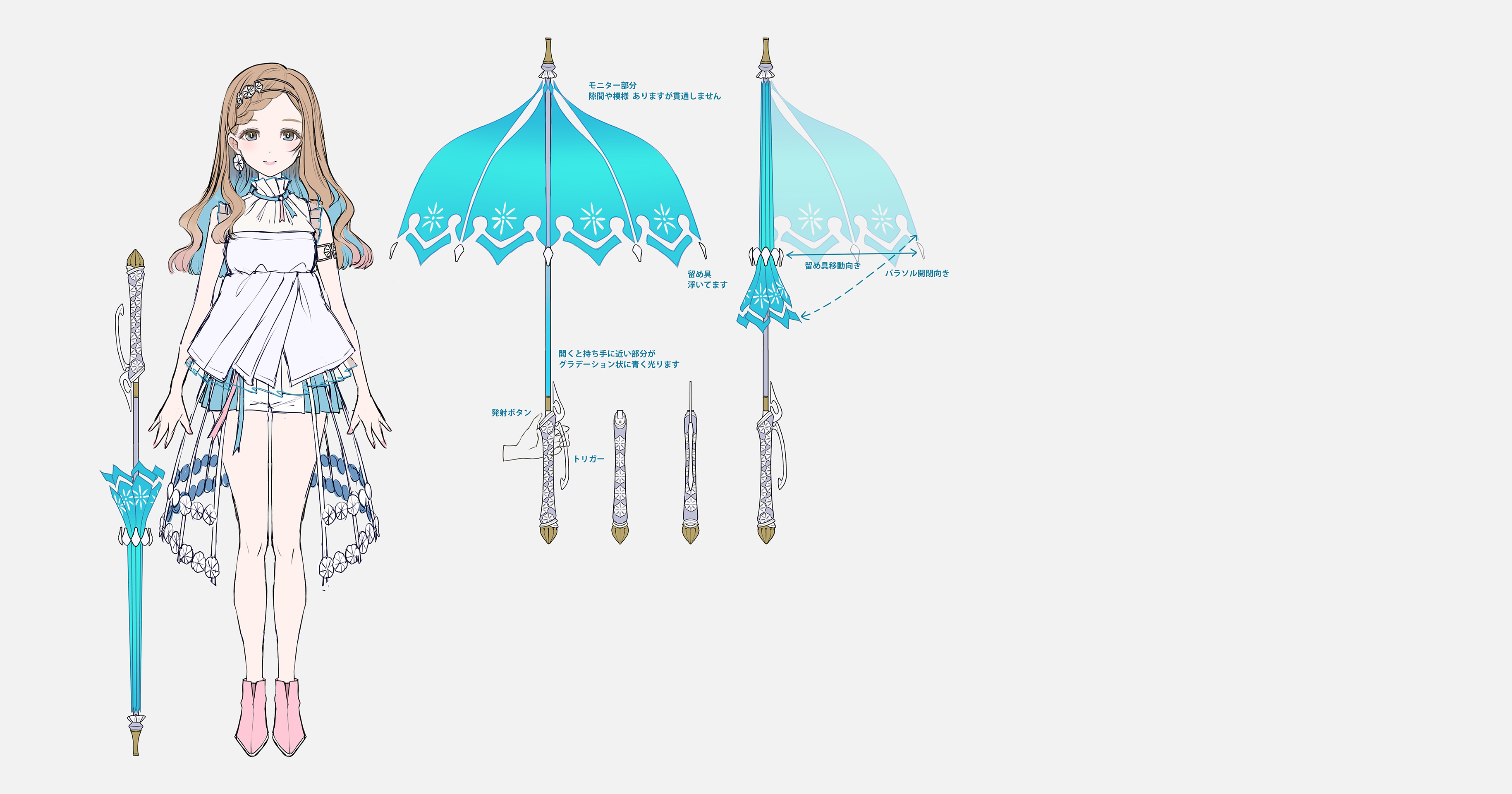 1girl a-pose absurdres armlet blue_hair blue_ribbon boots braid braided_bangs brown_hair cherico colored_inner_hair commentary_request crinoline culottes full_body grey_background grey_eyes hair_over_shoulder high_collar highres jewelry layered_shirt long_hair multicolored_hair neck_ribbon negative_space official_art parasol pink_boots pink_lips pink_nails reference_sheet ribbon second-party_source shirt simple_background sleeveless sleeveless_shirt smile swept_bangs tanaka_san translation_request umbrella voisona wavy_hair white_shirt