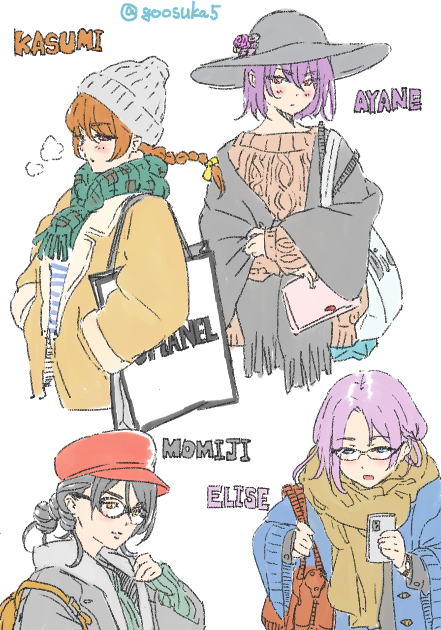 4girls ayane_(doa) black_hair braid brown_hair cellphone character_name cold dead_or_alive elise_(doa) glasses goosuka hat highres jacket kasumi_(doa) long_hair momiji_(ninja_gaiden) multiple_girls phone pink_hair purple_hair scarf short_hair sweater wide_sleeves