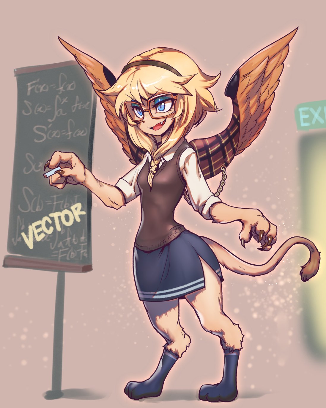 1girl :d black_skirt black_socks blonde_hair body_fur brown_hairband brown_vest chain chalk chalkboard claws fang feathered_wings full_body furry furry_female glasses green_eyes grey_fur hairband highres holding holding_chalk open_mouth original phantom_cross shirt short_hair skirt smile socks solo sphinx standing tail vest white_shirt wings