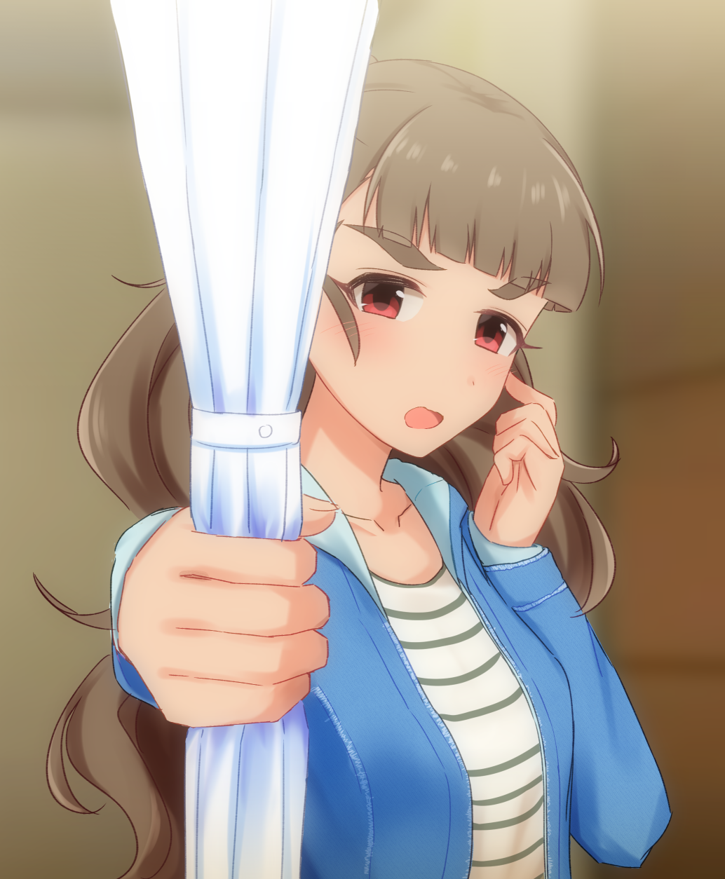 1girl blunt_bangs brown_hair eyebrows highres idolmaster idolmaster_cinderella_girls justice/ryo kamiya_nao long_sleeves open_mouth solo