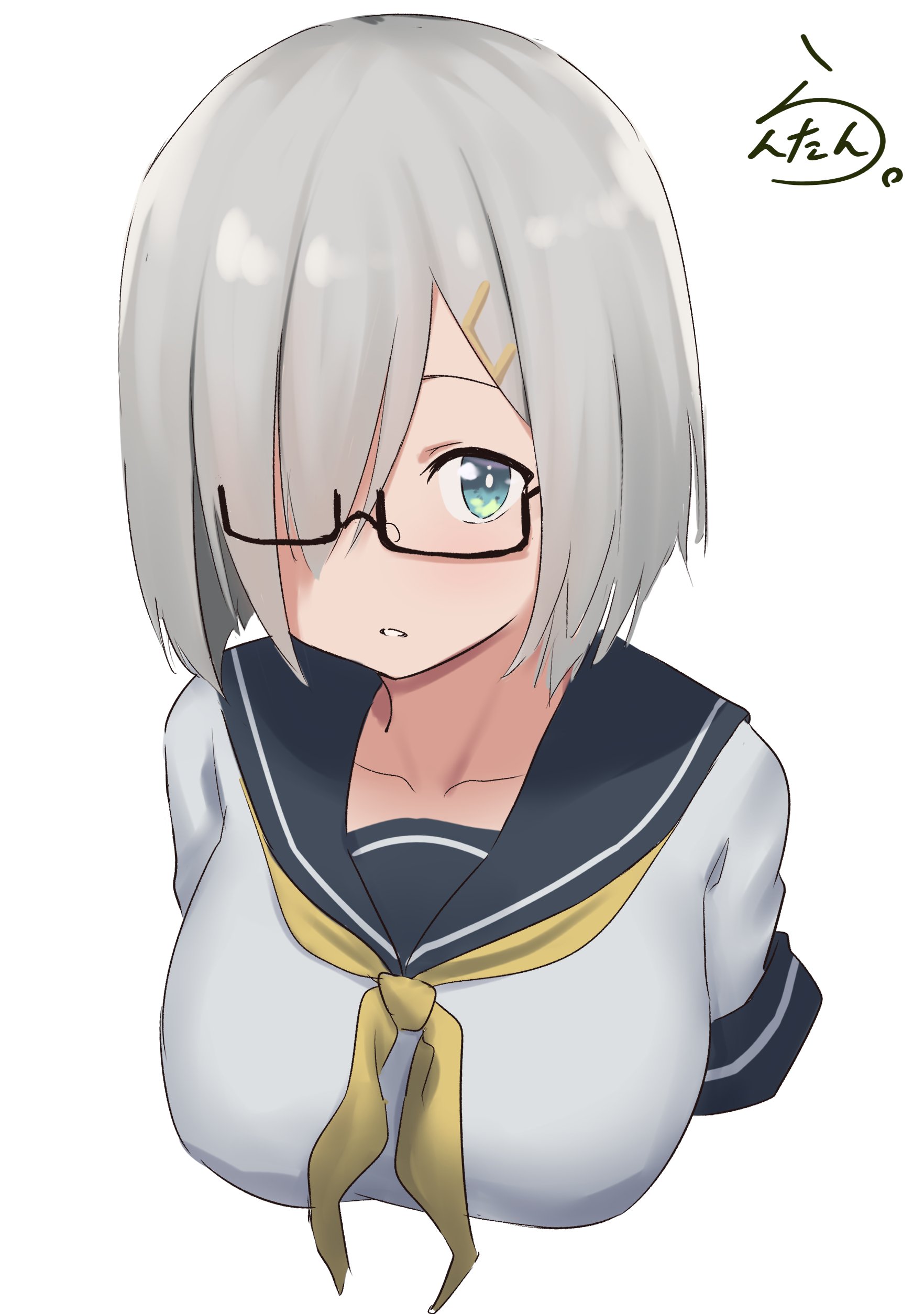 1girl absurdres bespectacled blue_eyes blush breasts glasses grey_hair grey_sailor_collar hair_ornament hair_over_one_eye hairclip hamakaze_(kancolle) highres kantai_collection lanthan large_breasts looking_at_viewer neckerchief sailor_collar school_uniform serafuku short_hair short_sleeves sign simple_background solo upper_body white_background yellow_neckerchief