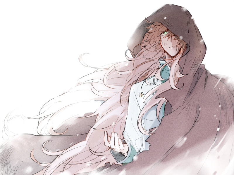 1boy brown_robe chaldea_staff_uniform chaldea_uniform coat fate/grand_order fate_(series) green_eyes hair_over_one_eye high_collar hood hood_up jewelry long_hair long_sleeves looking_at_viewer male_focus necklace orange_hair paper_texture parted_lips ring ring_necklace robe romani_archaman ruoyin simple_background snow solo torn_clothes torn_robe very_long_hair white_background white_coat
