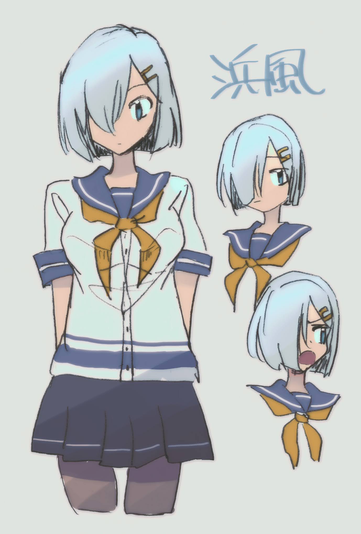 1girl arms_behind_back black_pantyhose black_skirt blue_eyes blue_sailor_collar breasts character_name closed_mouth grey_background grey_hair hair_between_eyes hair_ornament hair_over_one_eye hairclip hamakaze_(kancolle) highres kantai_collection large_breasts multiple_views neckerchief nnkhmhm one-hour_drawing_challenge open_mouth orange_neckerchief pantyhose pleated_skirt sailor_collar school_uniform serafuku short_hair short_sleeves simple_background skirt