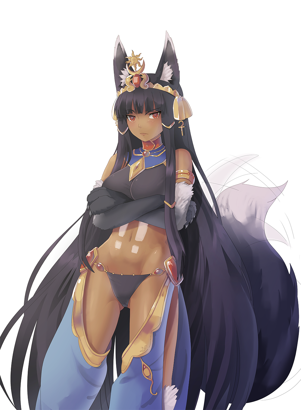 >:( ancient_egyptian ancient_egyptian_clothes animal_ears animal_hands anubis_(monster_girl_encyclopedia) black_fur chaps claws clothing_cutout crossed_arms crotch_cutout dark-skinned_female dark_skin dog_paws egyptian_mythology gem hair_ornament harem_pants highres jackal jackal_ears jackal_tail jewelry large_ears midriff monster_girl monster_girl_encyclopedia monster_girl_saga nennanennanennas pants red_eyes red_gem revealing_clothes shoshanah snake_hair_ornament tail tail_wagging tattoo tsundere v-shaped_eyebrows wolf_ears wolf_tail