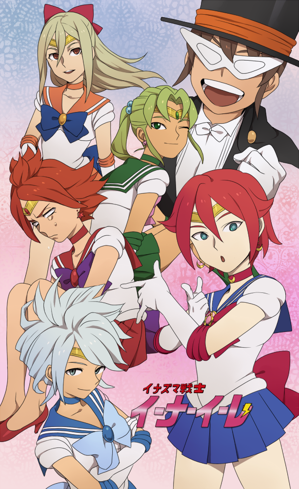 6+boys afuro_terumi bishoujo_senshi_sailor_moon blonde_hair blue_sailor_collar blue_skirt bow brown_hair choker cosplay crossdressing crossdressing_(mtf) earrings elbow_gloves endou_mamoru gloves green_eyes green_hair green_skirt hat high_heels inazuma_eleven inazuma_eleven_(series) inner_senshi jewelry kiyama_hiroto long_hair magical_girl male_focus mask midorikawa_ryuuji mosako multiple_boys nagumo_haruya one_eye_closed open_mouth orange_skirt parody ponytail red_bow red_hair ribbon sailor_collar sailor_jupiter sailor_jupiter_(cosplay) sailor_mars sailor_mars_(cosplay) sailor_mercury sailor_mercury_(cosplay) sailor_moon sailor_moon_(cosplay) sailor_senshi sailor_venus sailor_venus_(cosplay) shoes short_hair skirt smile suzuno_fuusuke tears top_hat trap tuxedo tuxedo_kamen tuxedo_kamen_(cosplay) white_gloves white_hair wink