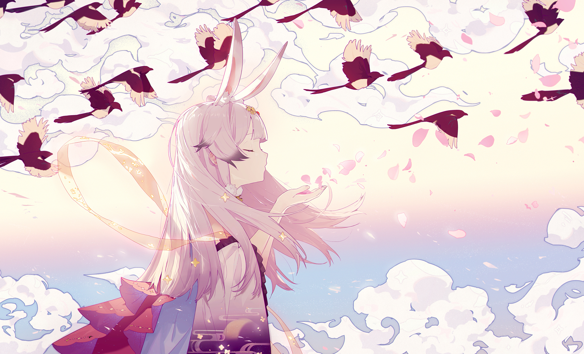 1girl animal_ears bird blowing closed_eyes cloud cupping_hands hair_ornament highres long_hair original own_hands_together petals rabbit_ears shigeru_do_dai_ga_cha sky solo