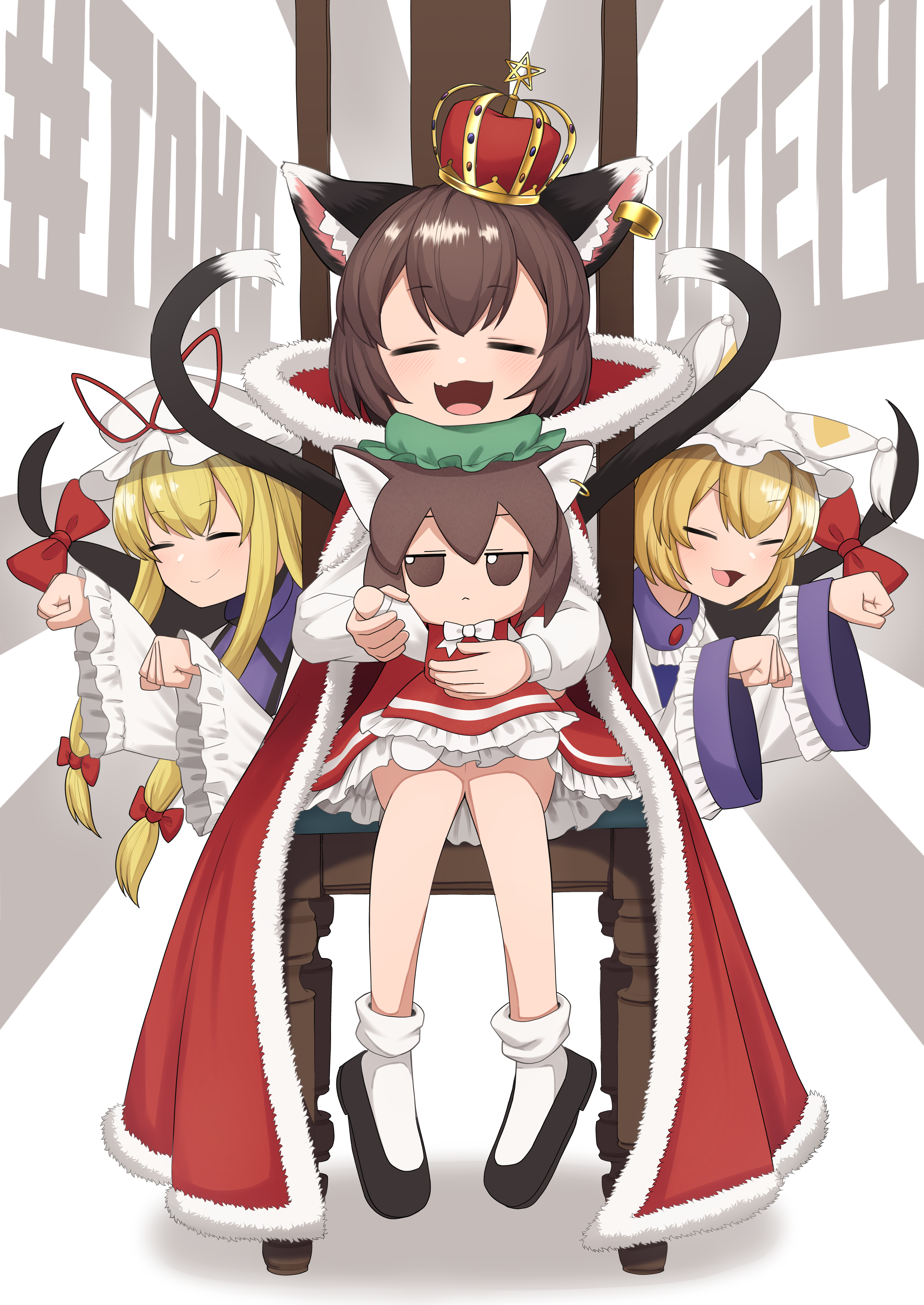 3girls :d absurdres alternate_headwear animal_ear_fluff animal_ears asakura_haru bobby_socks bow bowtie brown_hair cat_ears cat_tail chair character_doll chen closed_eyes commentary_request crown doll double-parted_bangs earrings fang fox_ears frilled_sleeves frills full_body fumo_(doll) fur_trim gap_(touhou) hands_up happy hat highres holding holding_doll jewelry knees_together_feet_apart light_blush long_sleeves mini_crown mob_cap multiple_girls multiple_tails nekomata open_mouth paw_pose petticoat pigeon-toed red_crown red_robe red_skirt robe shadow short_hair simple_background single_earring sitting skin_fang skirt sleeves_past_wrists smile socks tail tail_raised tilted_headwear touhou two_tails white_background white_bow white_bowtie wide_sleeves yakumo_family_(touhou) yakumo_ran yakumo_yukari