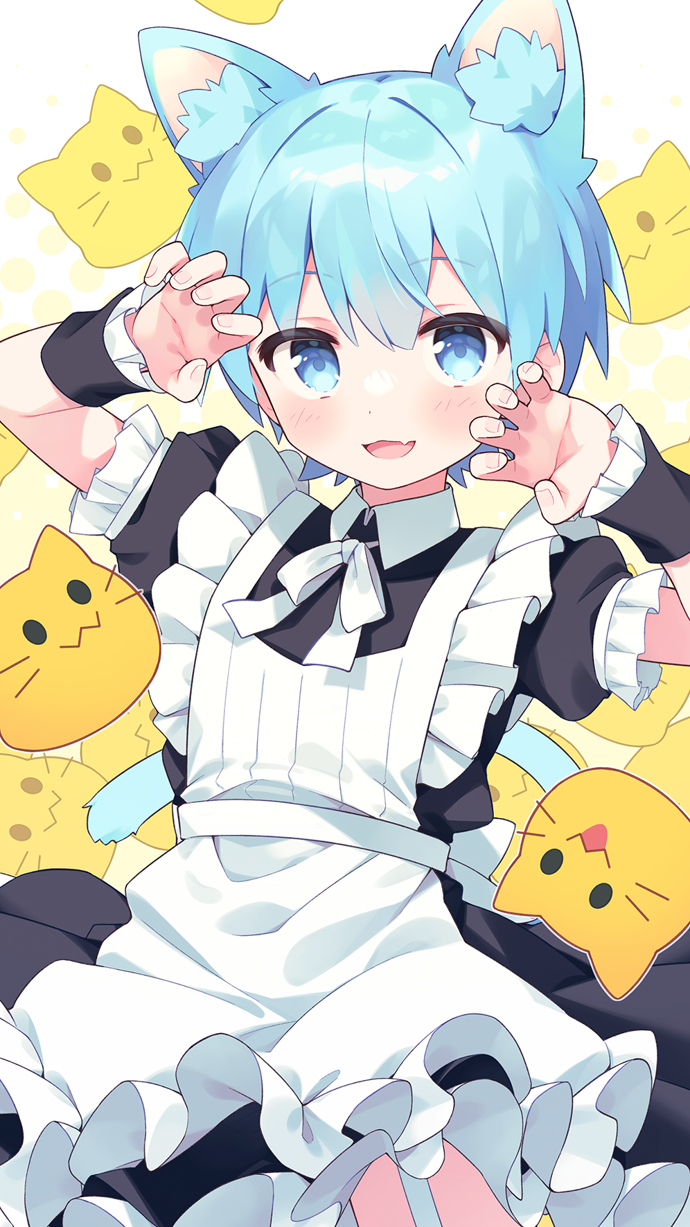 1girl animal_ear_fluff animal_ears blue_eyes blue_hair blush commentary_request fang fingernails highres kano_hito looking_at_viewer maid misskey.io murakami-san_(misskey.io) open_mouth skin_fang smile thighs wrist_cuffs