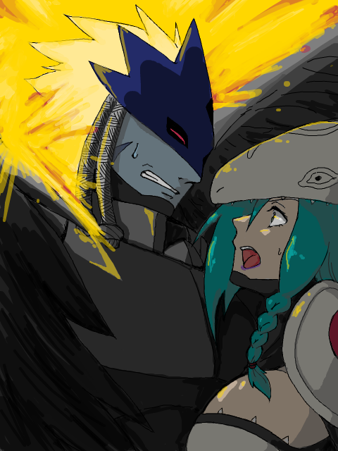 1boy 1girl beelzebumon_(digimon_xros_wars) closed_eyes couple digimon digimon_xros_wars looking_at_another mask mervamon