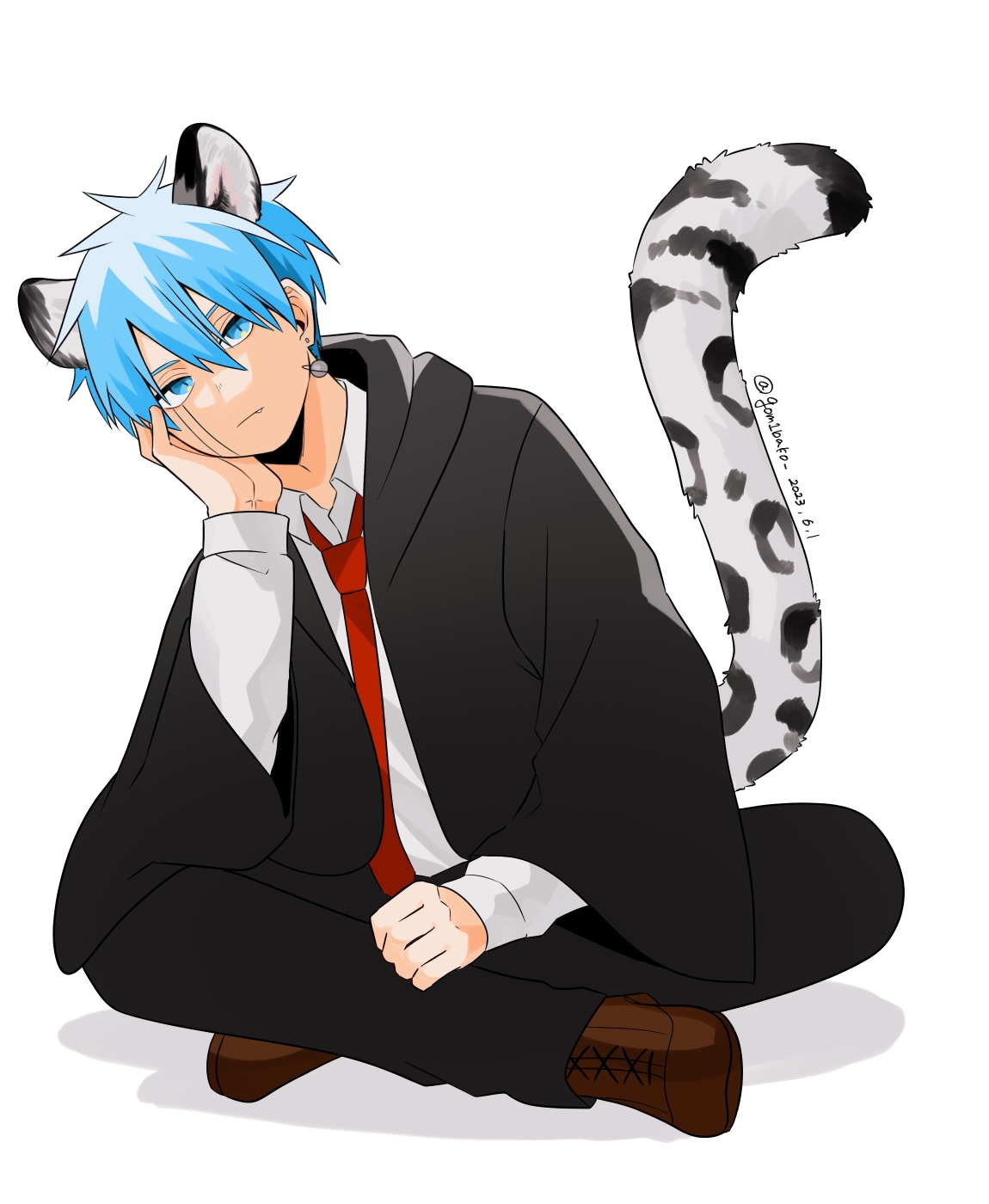 1boy animal_ears black_robe brown_footwear cheek_rest collared_shirt expressionless fang genjitsu_o_miro green_hair hair_between_eyes highres lance_crown leaning_to_the_side leopard_ears leopard_tail long_sleeves mashle necktie planet_earrings red_necktie robe shirt short_hair simple_background solo tail white_background white_shirt wide_sleeves