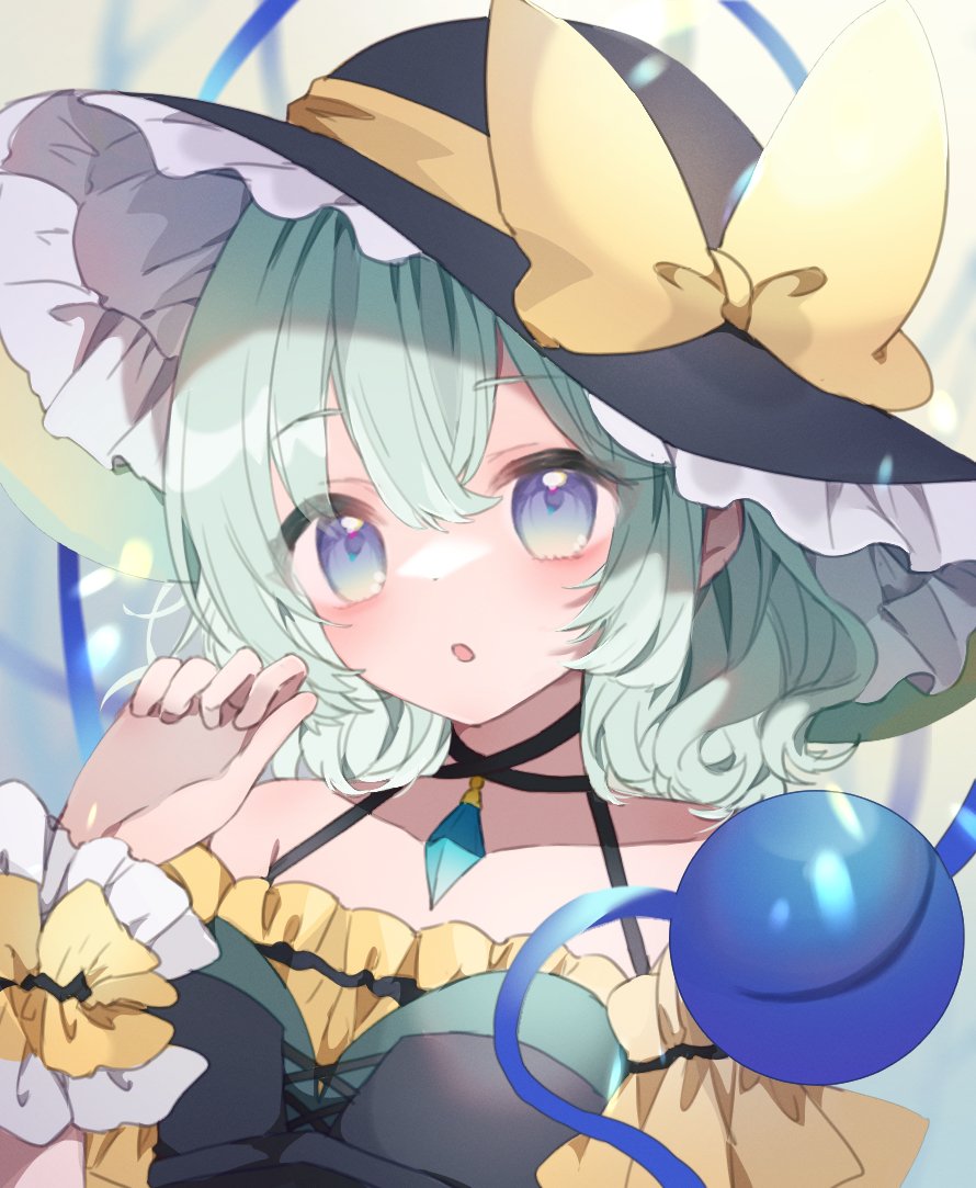 1girl black_hat bow commentary frilled_hat frills green_eyes green_hair hat hat_bow heart heart_of_string komeiji_koishi open_mouth re_re_merry short_hair solo third_eye touhou upper_body yellow_bow