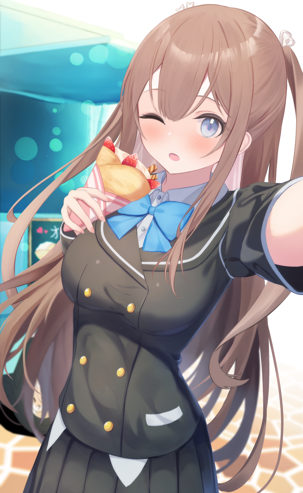 1girl ange_vierge black_jacket black_skirt blue_bow blue_eyes blush bow breasts brown_hair collared_shirt commentary_request crepe dress_shirt food fruit hair_between_eyes highres hinata_miumi holding holding_crepe holding_food jacket looking_at_viewer medium_breasts one_eye_closed open_mouth pleated_skirt reaching reaching_towards_viewer roido_(taniko-t-1218) school_uniform selfie shirt short_sleeves skirt solo strawberry two_side_up white_shirt