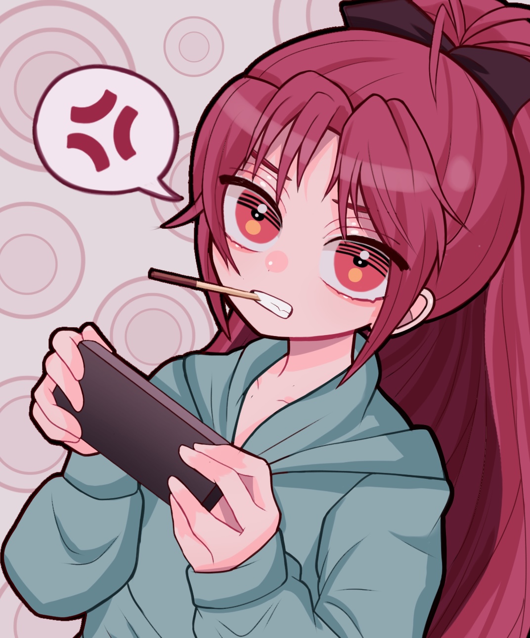 1girl anger_vein blue_jacket bow cellphone circle collarbone food food_in_mouth hair_bow highres holding holding_phone jacket keropiki long_hair looking_at_viewer looking_up mahou_shoujo_madoka_magica phone playing_games playing_video_games pocky pocky_in_mouth ponytail red_eyes red_hair sakura_kyoko smartphone spoken_anger_vein