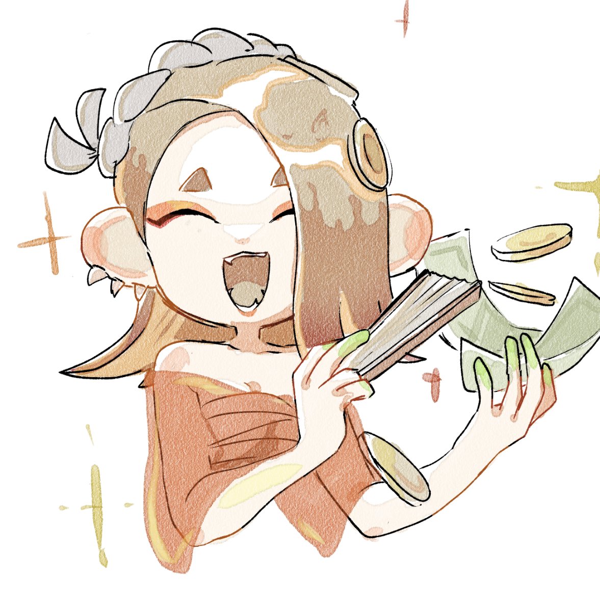 1girl :d ^_^ banknote bare_shoulders chest_sarashi closed_eyes coin colored_skin dollar_bill earrings eyeshadow folded_fan folding_fan gold_coin green_skin hachimaki hand_fan headband holding holding_fan holding_money jewelry light_brown_hair long_hair makeup medium_hair money multicolored_skin multiple_earrings nejiri_hachimaki nintendo octoling open_mouth orange_eyeshadow sarashi shiver_(deep_cut_outfit)_(splatoon) shiver_(splatoon) short_eyebrows simple_background smile solo splatoon_(series) splatoon_3 suction_cups tentacle_hair tooth_earrings two-tone_skin upper_body veryfatbigcat white_background