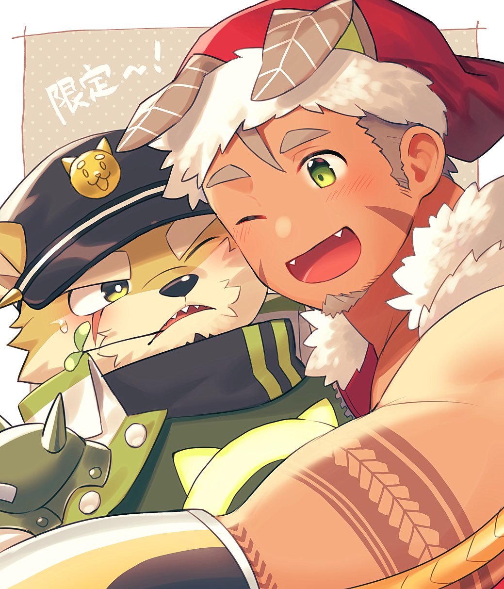 2boys animal_ears armor bara blush dog_boy facial_hair gomeisa_(live_a_hero) green_eyes grey_hair hat highres hozu_(hozumi) live_a_hero looking_at_another male_focus multiple_boys muscular muscular_male one_eye_closed open_mouth procy_(live_a_hero) santa_costume santa_hat short_hair shoulder_armor smile translation_request