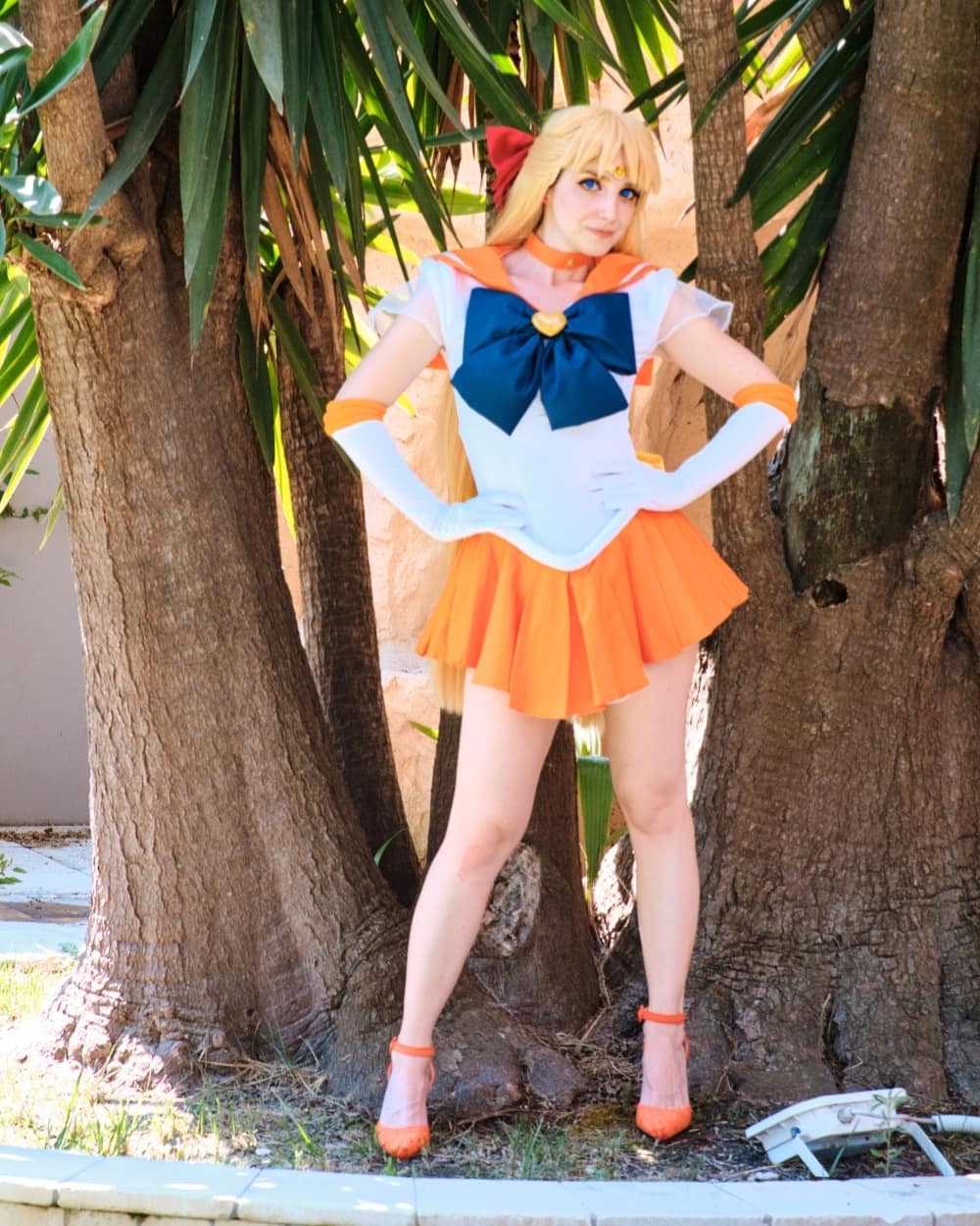 1girl aino_minako bishoujo_senshi_sailor_moon blonde_hair blue_eyes bow cosplay hand_on_own_hip highres long_hair photo_(medium) real_life red_bow sabry_la_puccia sailor_venus sailor_venus_(cosplay) skirt tree