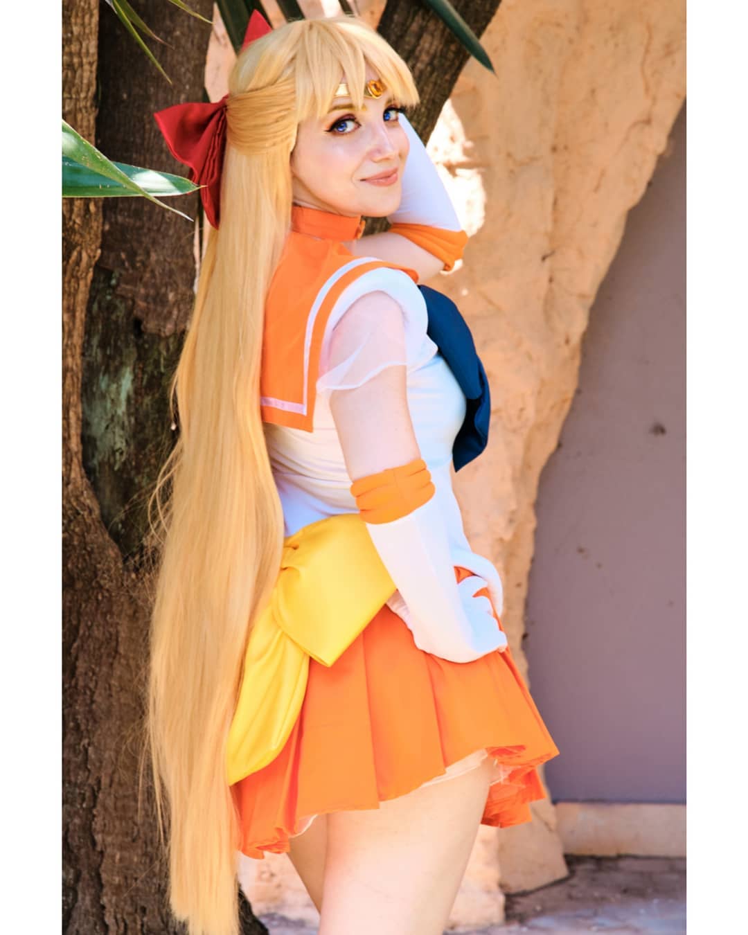 1girl aino_minako bishoujo_senshi_sailor_moon blonde_hair blue_eyes bow breasts cosplay from_behind hand_on_own_hip highres long_hair looking_at_viewer looking_back looking_to_the_side medium_breasts photo_(medium) real_life red_bow sabry_la_puccia sailor_venus sailor_venus_(cosplay) skirt tree very_long_hair