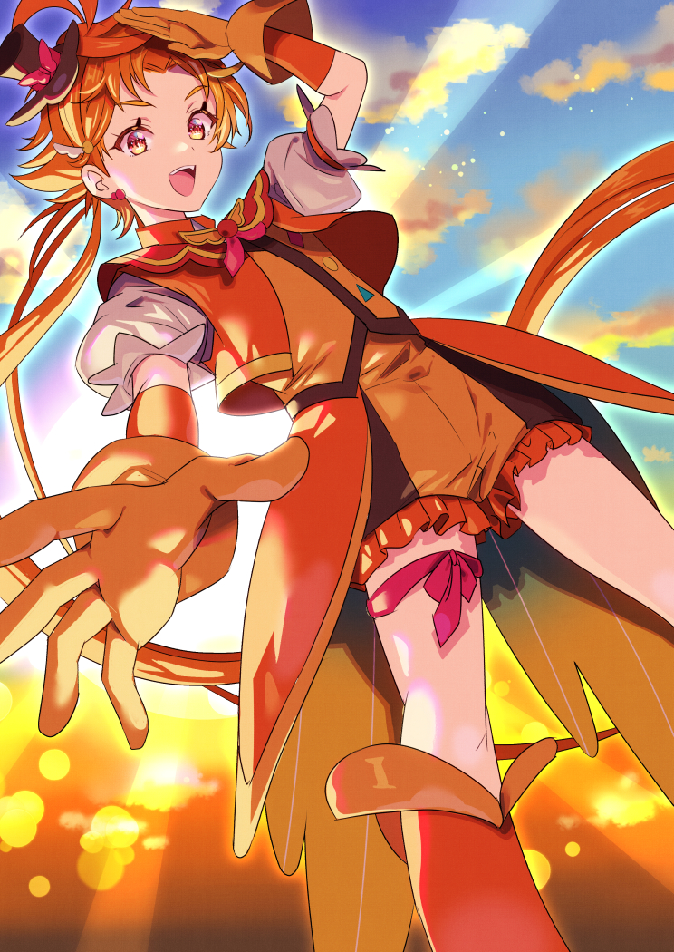 1boy :d boots brooch cloud cure_wing earrings gloves hair_ornament hat hirogaru_sky!_precure jewelry long_hair looking_at_viewer magical_boy male_focus mini_hat mini_top_hat open_mouth orange_eyes orange_gloves orange_hair orange_theme piyopuni0521 ponytail precure puffy_short_sleeves puffy_sleeves red_eyes ribbon salute short_sleeves shorts skirt sky smile solo top_hat vest wing_brooch wing_hair_ornament yuunagi_tsubasa