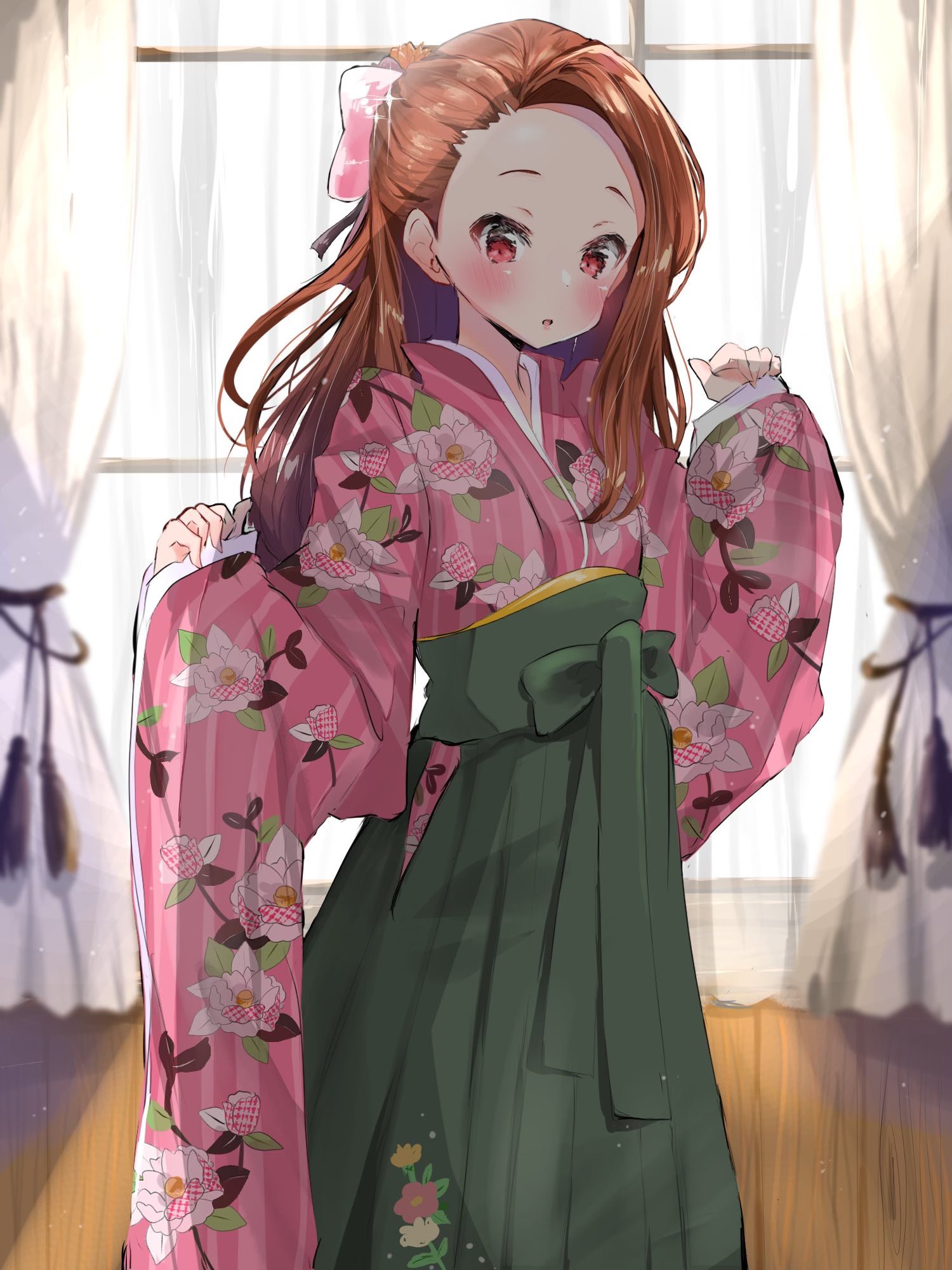 1girl blurry blush bow breasts brown_hair commentary curtains day depth_of_field dot_nose floral_print floral_print_kimono furisode green_bow green_hakama hair_bow hair_ribbon hakama hands_up highres idolmaster idolmaster_(classic) idolmaster_million_live! idolmaster_million_live!_theater_days indoors japanese_clothes kimono long_hair long_sleeves looking_at_viewer minase_iori open_mouth pink_kimono pink_ribbon print_kimono red_eyes ribbon sleeves_past_fingers sleeves_past_wrists small_breasts solo striped_clothes striped_kimono sunlight waist_bow wide_sleeves window wooden_floor yuanagae