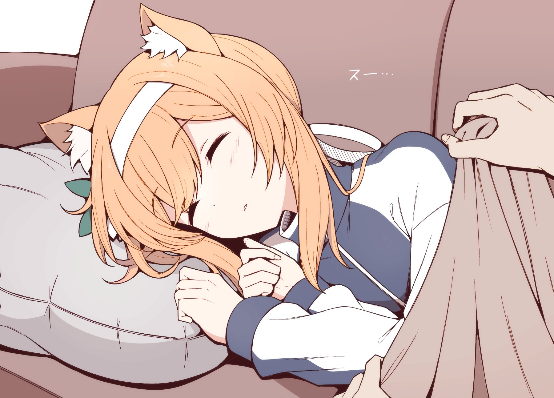 1girl animal_ear_fluff animal_ears blue_archive blush closed_eyes hairband highres jacket karikura_(atatata71) long_hair long_sleeves lying mari_(blue_archive) mari_(track)_(blue_archive) official_alternate_costume on_side orange_hair sleeping solo track_jacket white_hairband