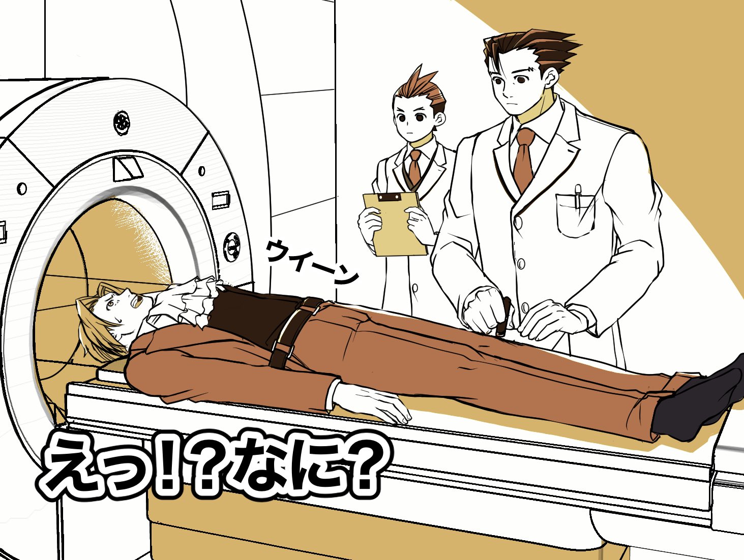 3boys ace_attorney antenna_hair apollo_justice arms_at_sides ascot belt breast_pocket buttons clipboard closed_mouth coat ct_scanner doctor forked_eyebrows formal_clothes frilled_ascot frills gloves hair_intakes holding holding_clipboard jacket lapels layered_sleeves long_sleeves looking_at_another lying male_focus miles_edgeworth monochrome mri_scanner multiple_boys necktie no_shoes object_in_pocket on_back open_clothes open_jacket open_mouth pants pen_in_pocket phoenix_wright pocket ragi_(od6fine) red_theme scared short_hair socks suit sweat translated
