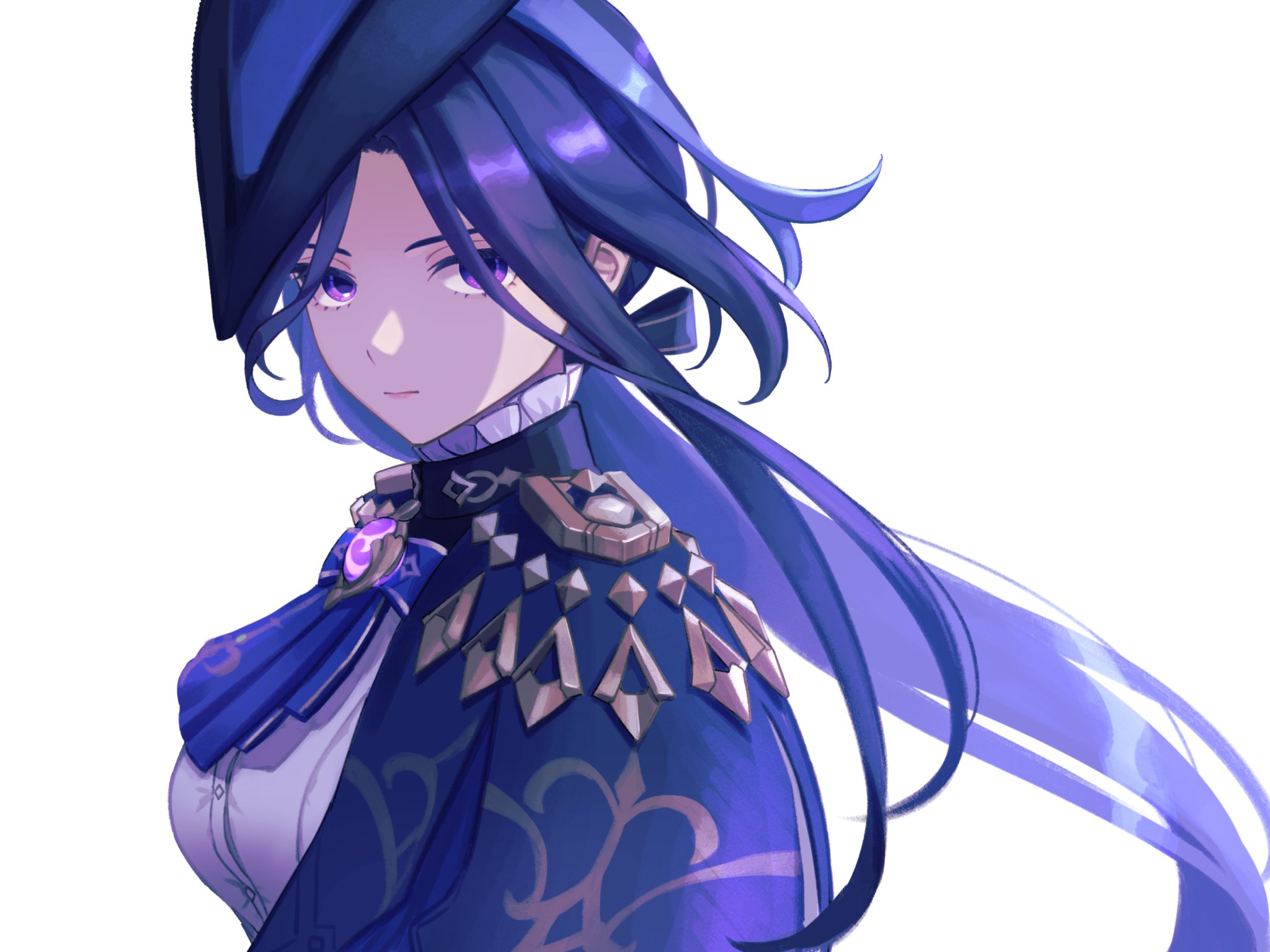 1girl 39_iduki :| blue_hair blue_hat breasts clorinde_(genshin_impact) closed_mouth epaulettes expressionless genshin_impact hat hat_feather highres jewelry long_hair looking_at_viewer low_ponytail medium_breasts ponytail purple_eyes simple_background solo tricorne upper_body vision_(genshin_impact) white_background