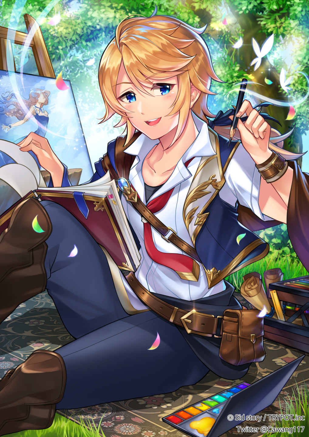 1boy :d belt belt_pouch black_ribbon blanket blonde_hair blue_eyes blue_pants blue_vest book boots box brown_belt brown_boots brown_capelet bug butterfly canvas_(object) capelet cawang copyright_notice day easel falling_petals feet_out_of_frame gold_trim grass hair_ribbon hand_up highres holding holding_pencil insect knee_boots knee_up lapels long_hair looking_at_viewer low_ponytail male_focus neckerchief official_art open_book open_clothes open_mouth open_vest outdoors paint painting_(object) pants pencil petals ponytail pouch red_neckerchief ribbon scroll shirt short_sleeves shoulder_belt sid_story side_cape sitting smile solo swept_bangs teeth tree undershirt upper_teeth_only vest white_shirt wing_collar wristband