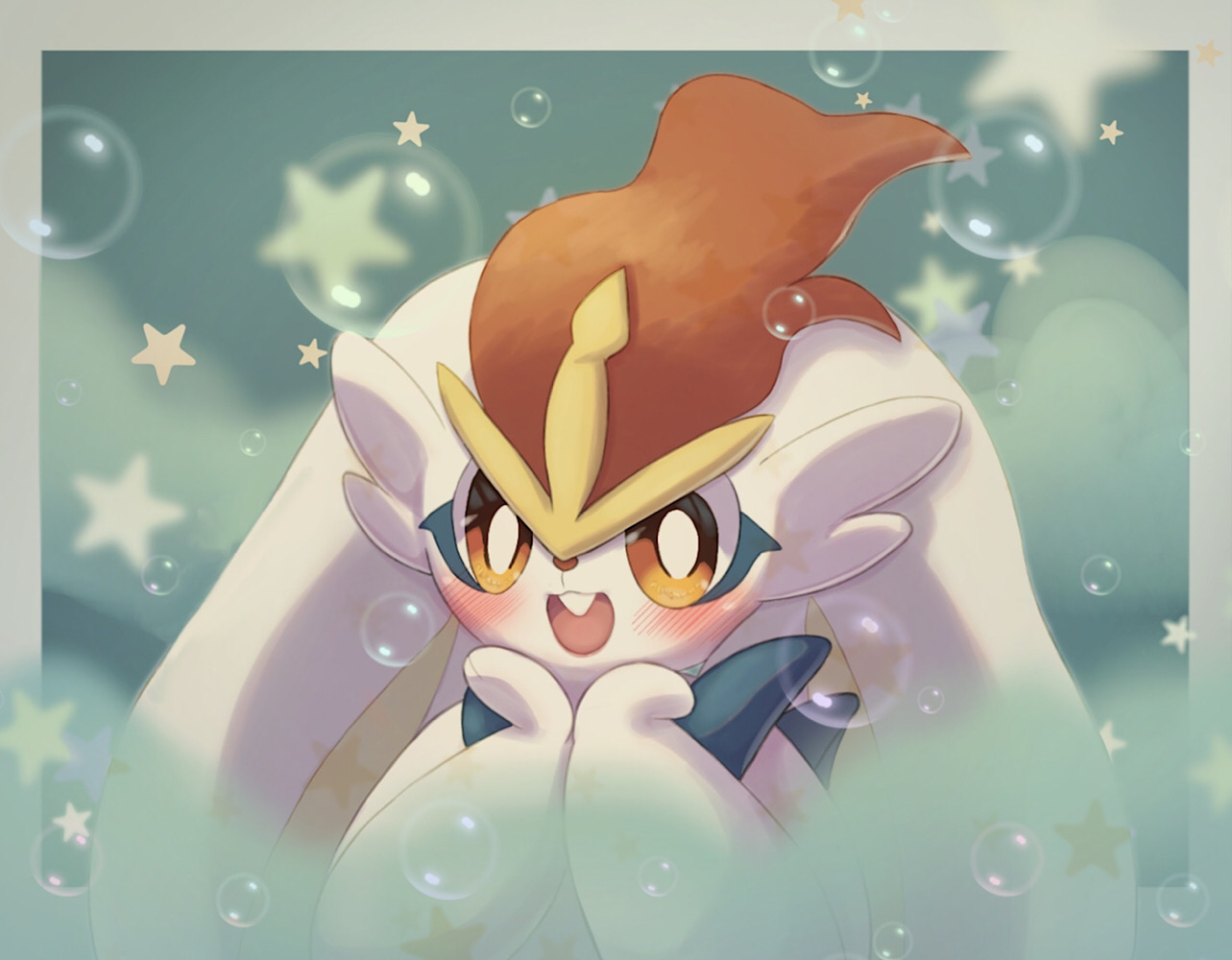 1girl animal_hands animal_nose aqua_background blue_fur blush body_fur border bright_pupils bubble buck_teeth cinderace dynamax female_focus furry furry_female gen_8_pokemon gigantamax gigantamax_cinderace grey_border hands_on_own_cheeks hands_on_own_face hands_up happy kagetsu_(pixiv_59460925) long_animal_ears looking_at_viewer nintendo open_mouth orange_eyes outside_border pokemon pokemon_(creature) rabbit_ears rabbit_girl red_hair short_hair smile solo star_(symbol) steam teeth two-tone_fur upper_body white_fur white_pupils