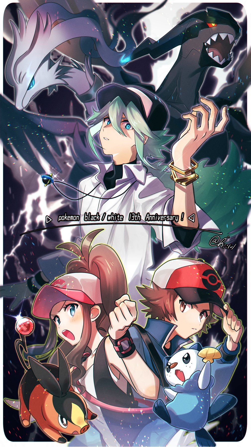 1girl 2boys anniversary baseball_cap blue_eyes blue_jacket blush brown_eyes brown_hair clenched_hand closed_mouth colored_sclera copyright_name gen_5_pokemon green_hair hat highres hii_(hii101) hilbert_(pokemon) hilda_(pokemon) jacket jewelry legendary_pokemon long_hair multiple_boys n_(pokemon) necklace nintendo open_mouth oshawott pokemon pokemon_(creature) pokemon_black_and_white ponytail red_sclera reshiram sidelocks sparkle tepig twitter_username zekrom