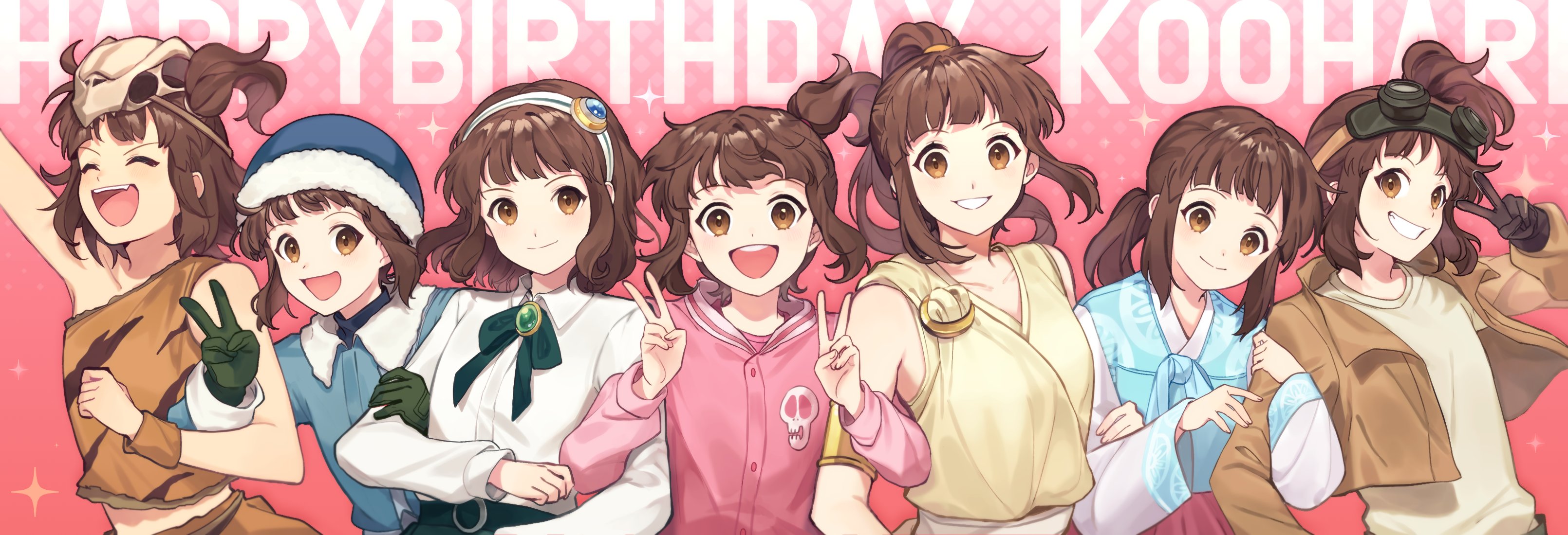 6+girls absurdres animal_print blue_headwear blue_shirt breasts brown_eyes brown_gloves brown_hair brown_jacket byoop_(byoru_u) character_name closed_eyes gloves goggles goggles_on_head green_gloves green_ribbon hairband hanbok happy_birthday hari_koo highres jacket jewelry korean_clothes long_sleeves medium_breasts medium_hair midriff multiple_girls open_mouth pink_background pink_shirt ponytail ribbon shirt smile the_haunted_house tiger_print v white_shirt
