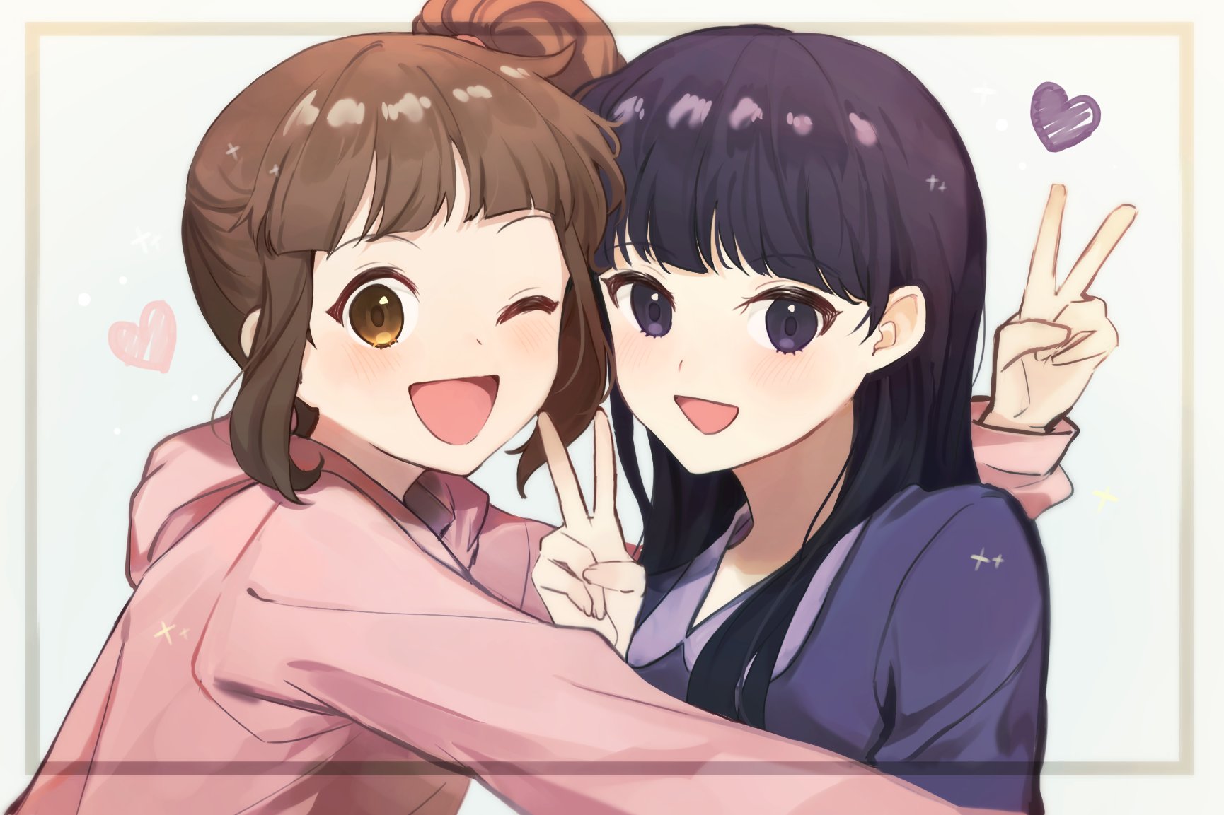 2girls black_hair border brown_eyes brown_hair byoop_(byoru_u) gaeun_lee hair_between_eyes hari_koo heart highres hood hoodie long_hair long_sleeves medium_hair multiple_girls one_eye_closed open_mouth pink_hoodie purple_shirt shirt the_haunted_house v