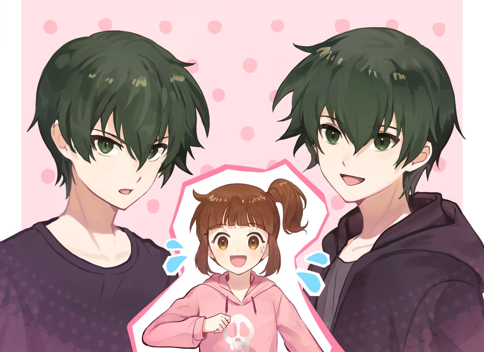 1girl 2boys black_hood black_shirt brown_hair byoop_(byoru_u) green_eyes green_hair hair_ornament hari_koo highres hood hooded_jacket hoodie jacket kanglim_choi long_sleeves medium_hair multiple_boys open_mouth pink_hoodie ponytail shirt short_hair skull the_haunted_house