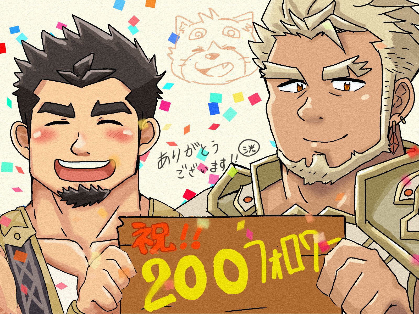 2boys bara beard blonde_hair blush character_request confetti crave_saga dark-skinned_male dark_skin doodle_inset excalibur_(crave_saga) eyebrow_cut facial_hair forked_eyebrows hand_up highres holding holding_sign horokeikam_love long_sideburns looking_at_viewer male_focus mature_male milestone_celebration multiple_boys muscular muscular_male pectoral_cleavage pectorals protagonist_(crave_saga) short_hair sideburns sign thick_eyebrows translation_request