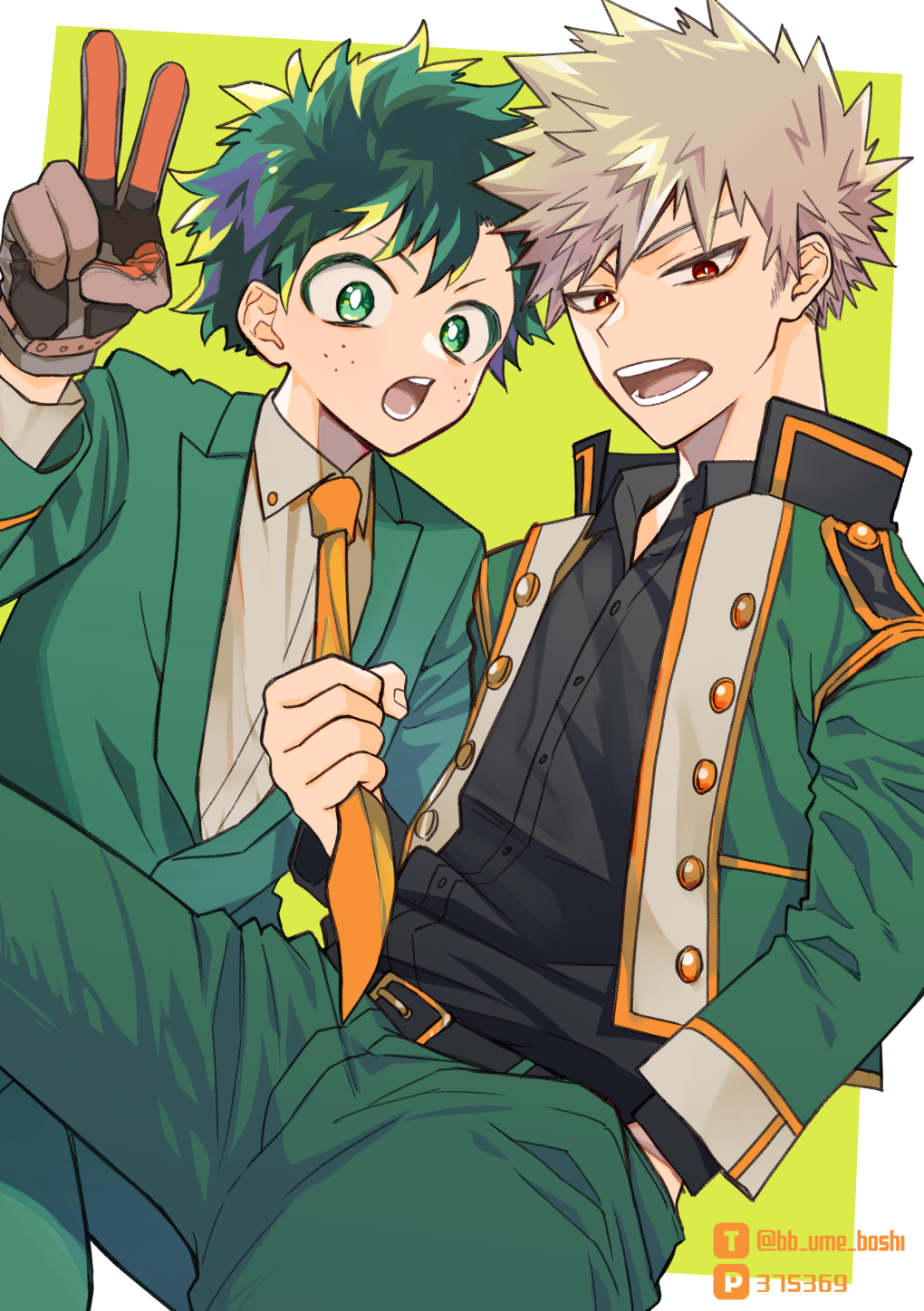2boys alternate_hair_color bakugou_katsuki belt belt_buckle black_belt black_shirt blonde_hair boku_no_hero_academia bright_pupils buckle buttons clothes_grab collared_shirt colored_eyelashes dress_shirt formal_clothes freckles gloves green_background green_hair green_jacket green_pants green_suit grey_shirt hand_in_pocket hand_up high_collar highres jacket lapels leaning_forward leg_up long_sleeves looking_at_viewer looking_to_the_side male_focus midoriya_izuku multicolored_hair multiple_boys necktie necktie_grab neckwear_grab notched_lapels official_alternate_costume open_collar open_mouth orange_necktie outside_border pants pixiv_id pixiv_logo pose_request purple_hair red_eyes shirt short_eyebrows short_hair side-by-side sideways_glance slit_pupils spiked_hair streaked_hair suit twitter_logo twitter_username ume_(326310) v v-shaped_eyebrows white_pupils wing_collar