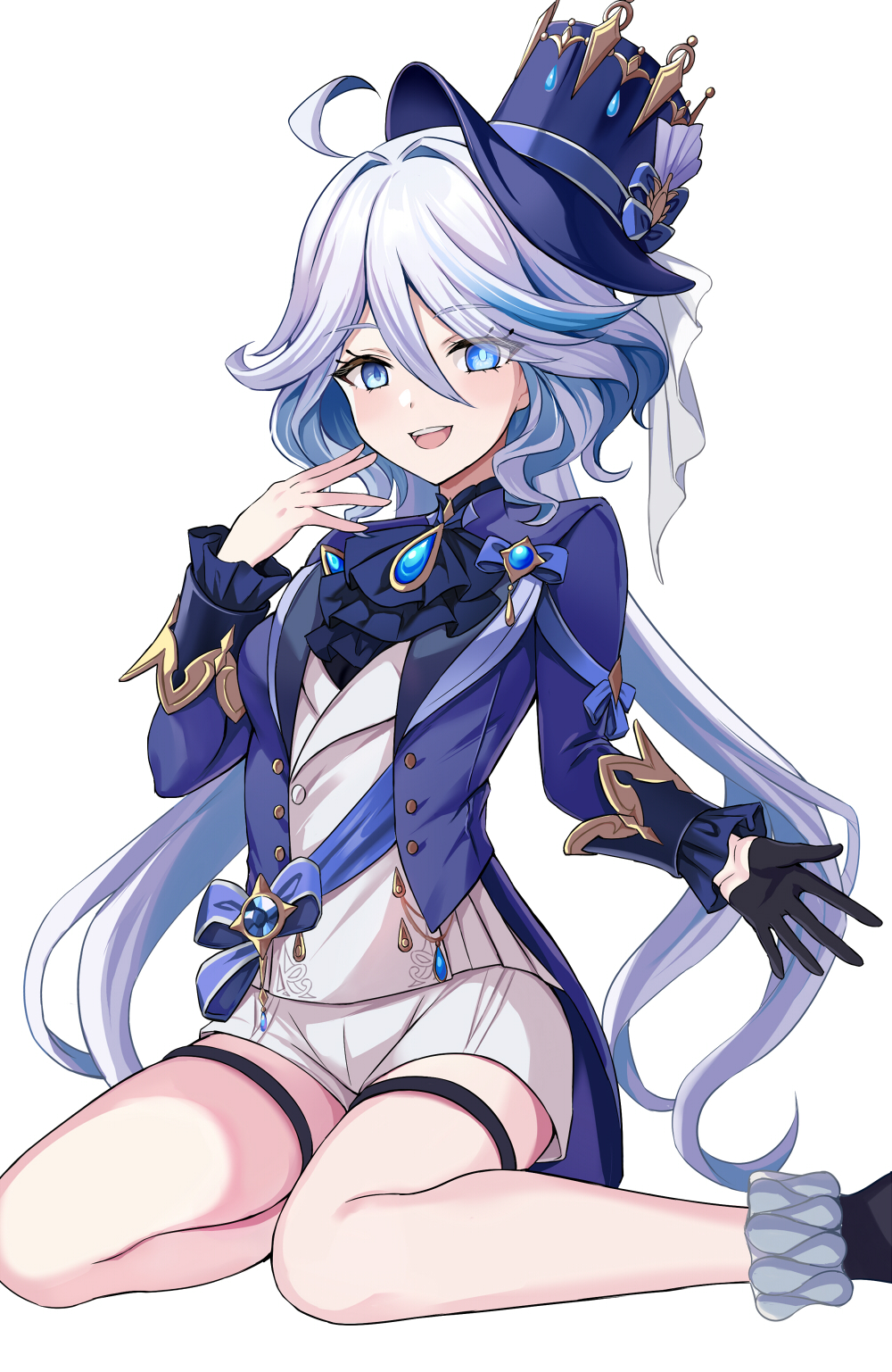 1girl blue_eyes blue_hair blue_hat furina_(genshin_impact) genshin_impact gloves harimoji hat highres light_blue_hair long_sleeves looking_at_viewer open_mouth single_glove smile solo