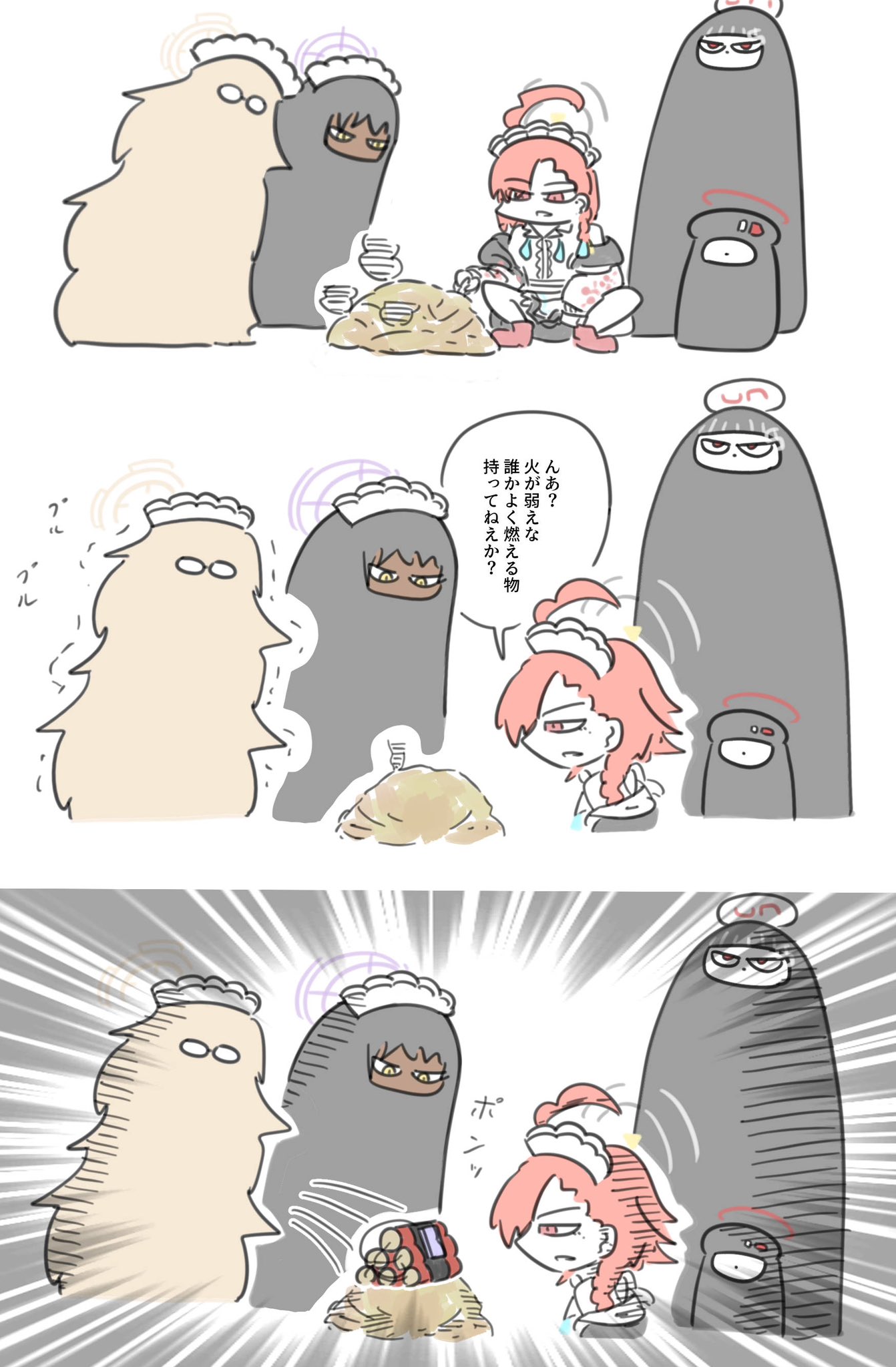 1girl akane_(blue_archive) blue_archive dark-skinned_female dark_skin dynamite emphasis_lines explosive facing_another glasses highres impending_doom jacket justice_task_force_member_(blue_archive) karin_(blue_archive) maid_headdress mole mole_under_eye neru_(blue_archive) rio_(blue_archive) sasasahitsuji slav_squatting speech_bubble squatting sukajan translation_request
