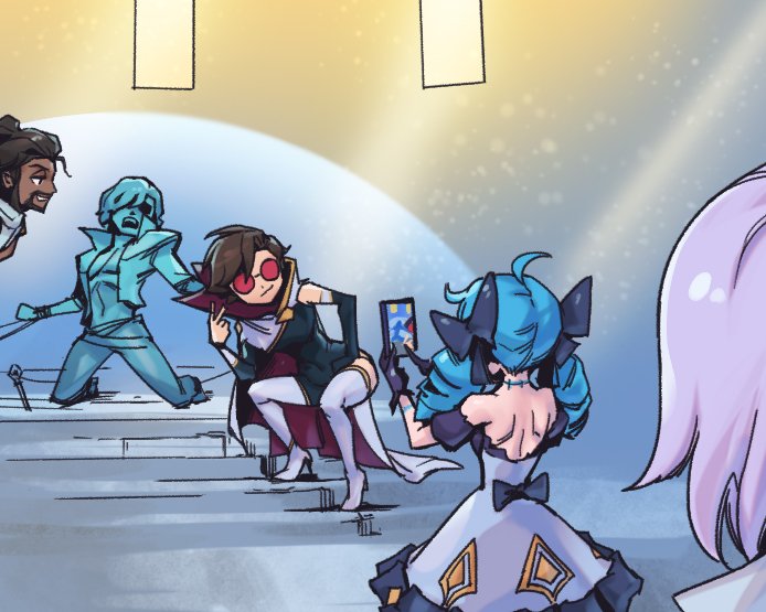 2boys 2girls ahoge akshan_(league_of_legends) bare_shoulders black_bow black_sleeves boots bow brown_hair dark-skinned_male dark_skin detached_sleeves dress dress_bow drill_hair green_hair grey_dress gwen_(league_of_legends) hair_bow holding holding_phone league_of_legends long_hair multicolored_background multiple_boys multiple_girls petrification phantom_cross phone red-tinted_eyewear riven_(league_of_legends) round_eyewear sentinel_riven sentinel_vayne short_hair smile taking_picture thigh_boots thighhighs tinted_eyewear twin_drills twintails v vayne_(league_of_legends) viego_(league_of_legends) white_thighhighs