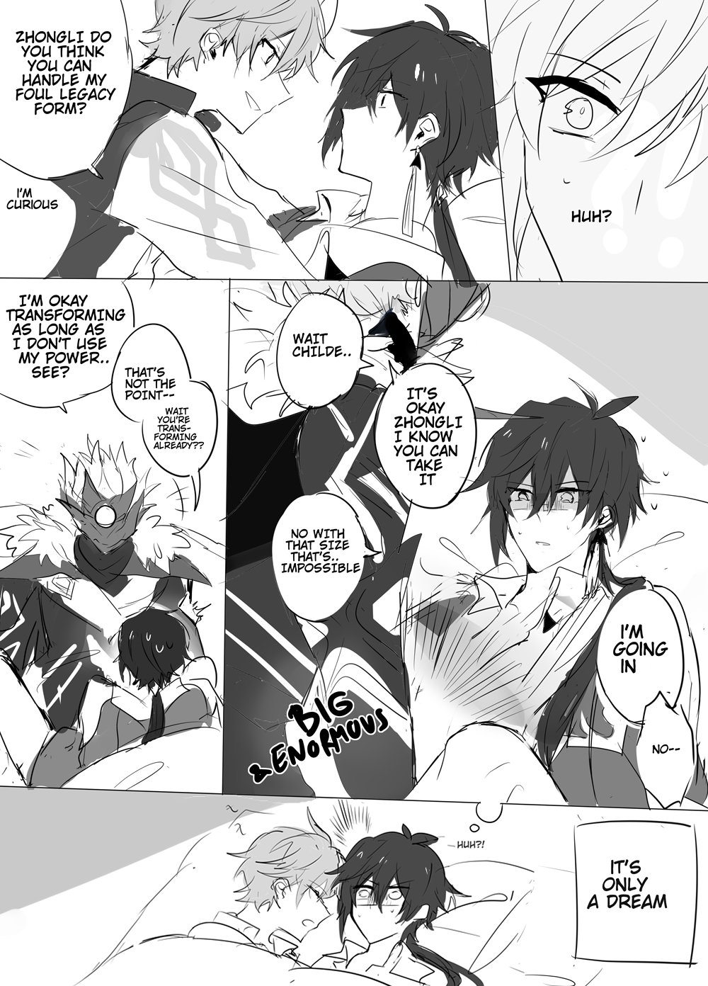 2boys dreaming efu_(angelschatedral99) english_text genshin_impact greyscale highres implied_yaoi monochrome multiple_boys speech_bubble tartaglia_(genshin_impact) yaoi zhongli_(genshin_impact)