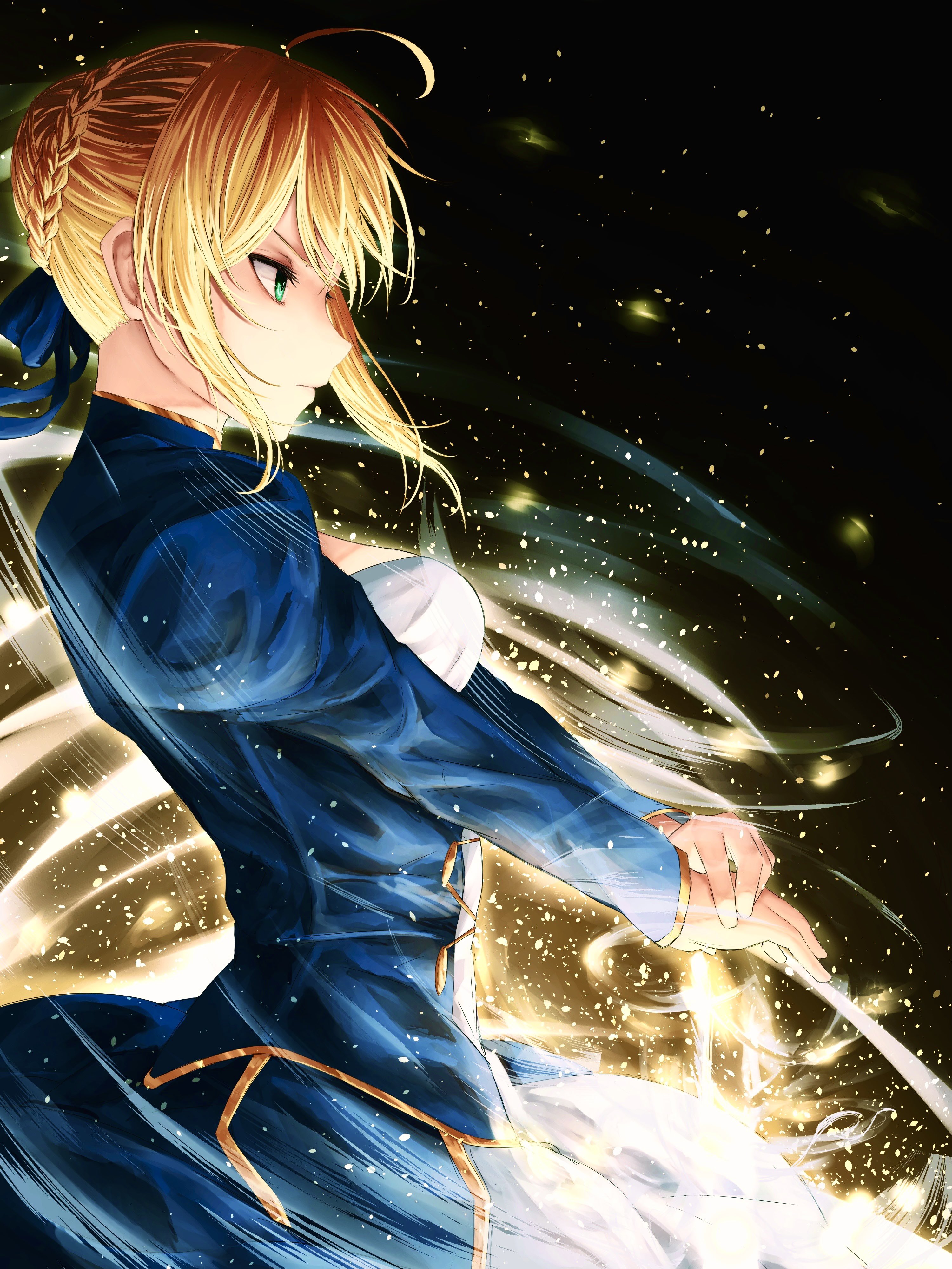 1girl absurdres ahoge artoria_pendragon_(fate) blonde_hair blue_dress blue_ribbon braid braided_bun breasts dress excalibur_(fate/stay_night) fate/grand_order fate/stay_night fate_(series) from_side green_eyes hair_bun hair_ribbon highres holding holding_sword holding_weapon long_sleeves planted planted_sword planted_weapon ribbon saber_(fate) short_hair small_breasts solo sword weapon yagi_(yagi5art)