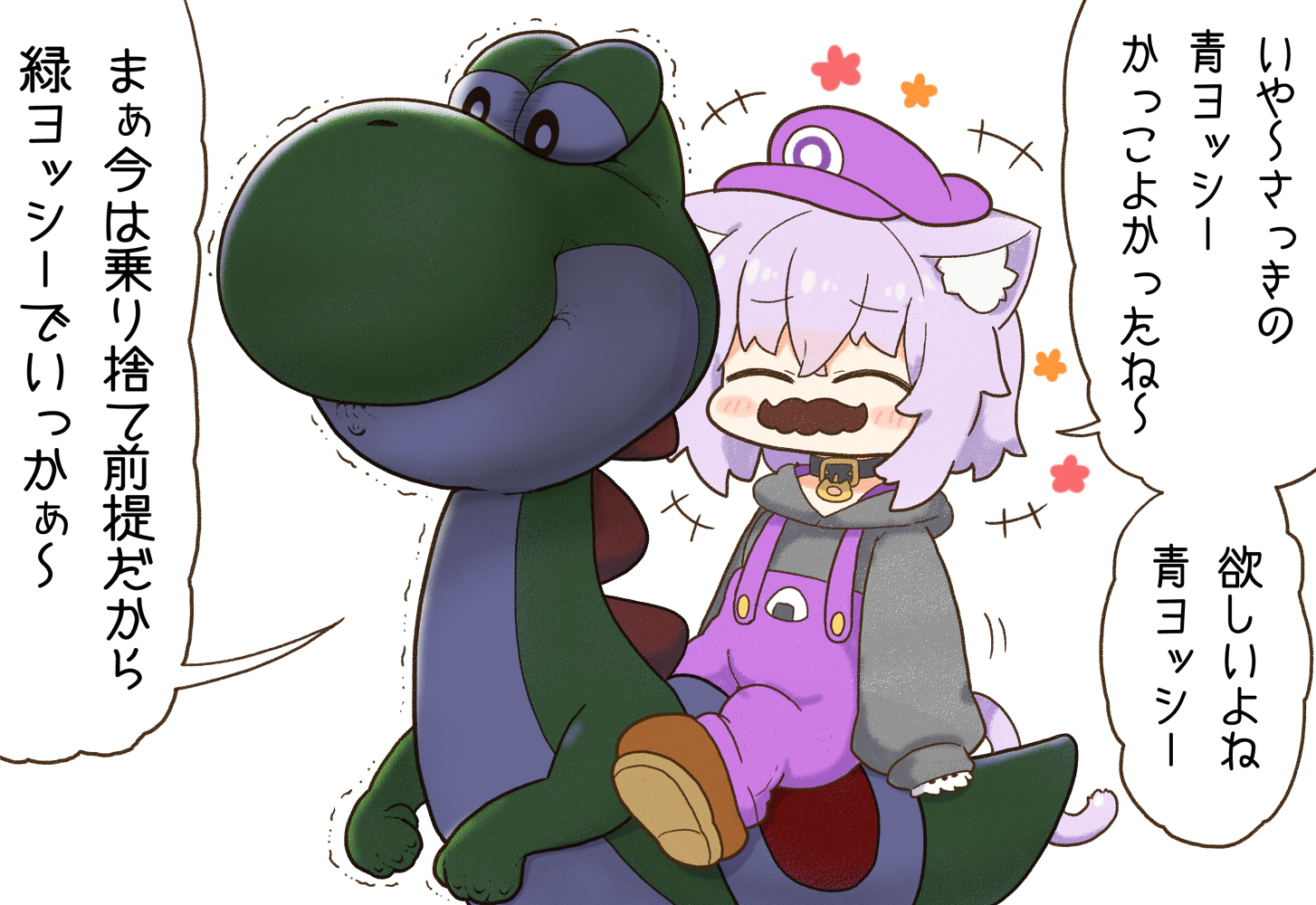 1boy 1girl animal_ears black_hoodie cat_ears cat_girl cat_tail closed_eyes commentary_request cosplay facial_hair hat hololive hood hoodie mario_(series) matarou_(matarou072) mustache nekomata_okayu nintendo overalls purple_hair purple_headwear purple_overalls sitting tail translation_request trembling virtual_youtuber yoshi