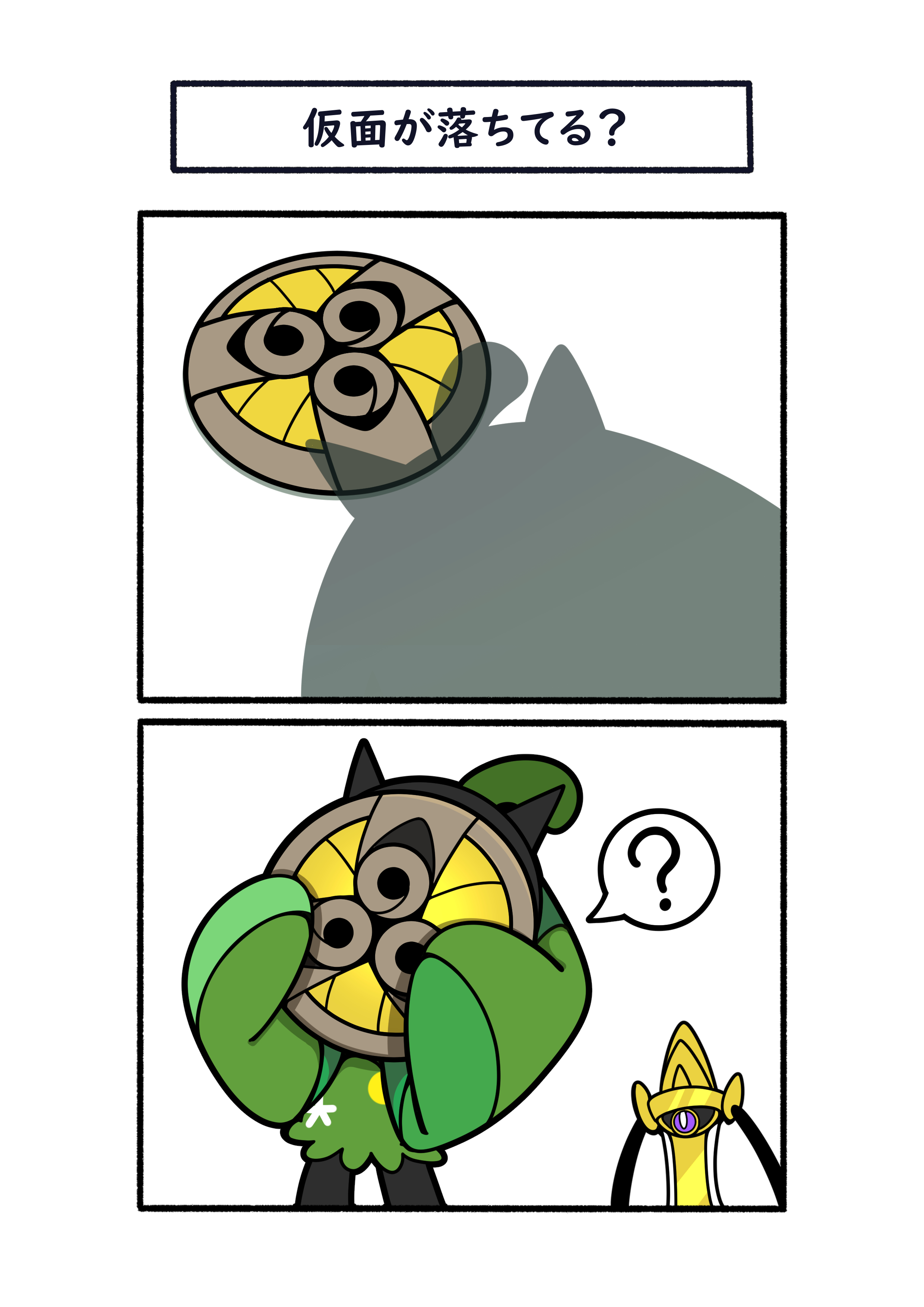 1girl 1other ? absurdres aegislash confused covered_face fang fukidashi_cotton gen_6_pokemon gen_9_pokemon highres holding holding_shield legendary_pokemon looking_at_another nintendo no_humans ogerpon pokemon pokemon_(creature) shield simple_background standing star_(symbol) translation_request white_background