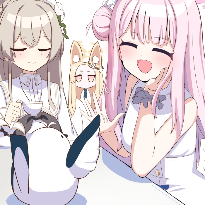 3girls :d ^_^ angel_wings animal_ear_fluff animal_ears arm_support bird blonde_hair blue_archive blunt_bangs brown_hair closed_eyes commentary_request cup detached_sleeves dress feathered_wings flower forehead fox_ears fox_girl hair_between_eyes hair_bun hair_flower hair_ornament hair_scrunchie halo head_rest high_five holding holding_cup long_hair long_sleeves looking_at_another mika_(blue_archive) multiple_girls nagisa_(blue_archive) open_mouth orange_eyes parted_bangs pink_hair scrunchie seia_(blue_archive) shooka sidelocks simple_background single_side_bun sleeveless sleeveless_dress smile table teacup turtleneck turtleneck_dress white_dress white_wings wings