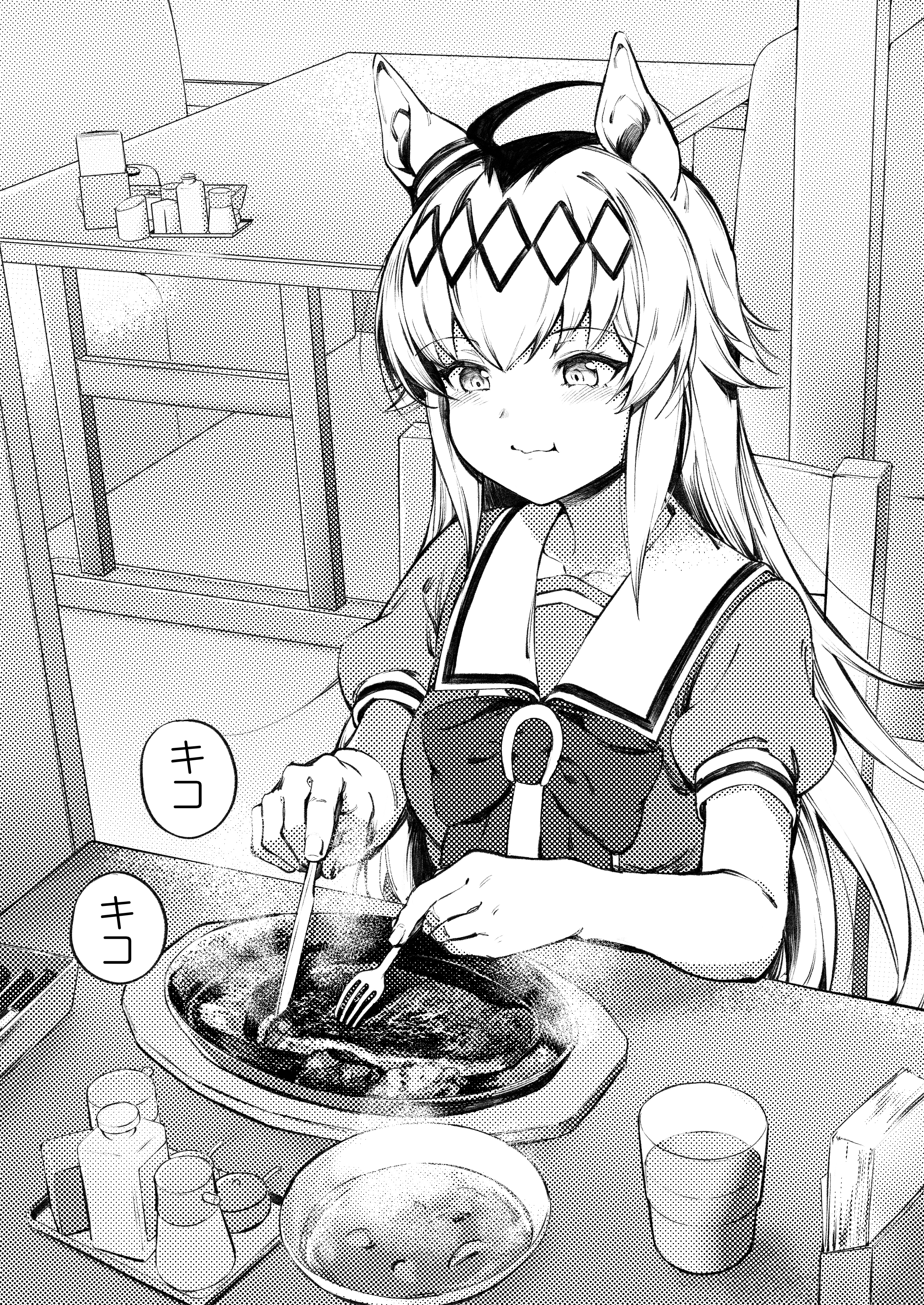 1girl absurdres ahoge animal_ears bow commentary_request cup drinking_glass eating food fork greyscale highres holding holding_fork holding_knife horse_ears horse_girl knife long_hair monochrome napkin_holder nihudau oguri_cap_(umamusume) pepper_shaker puffy_short_sleeves puffy_sleeves sailor_collar salt_shaker school_uniform short_sleeves smile solo table tracen_school_uniform umamusume very_long_hair