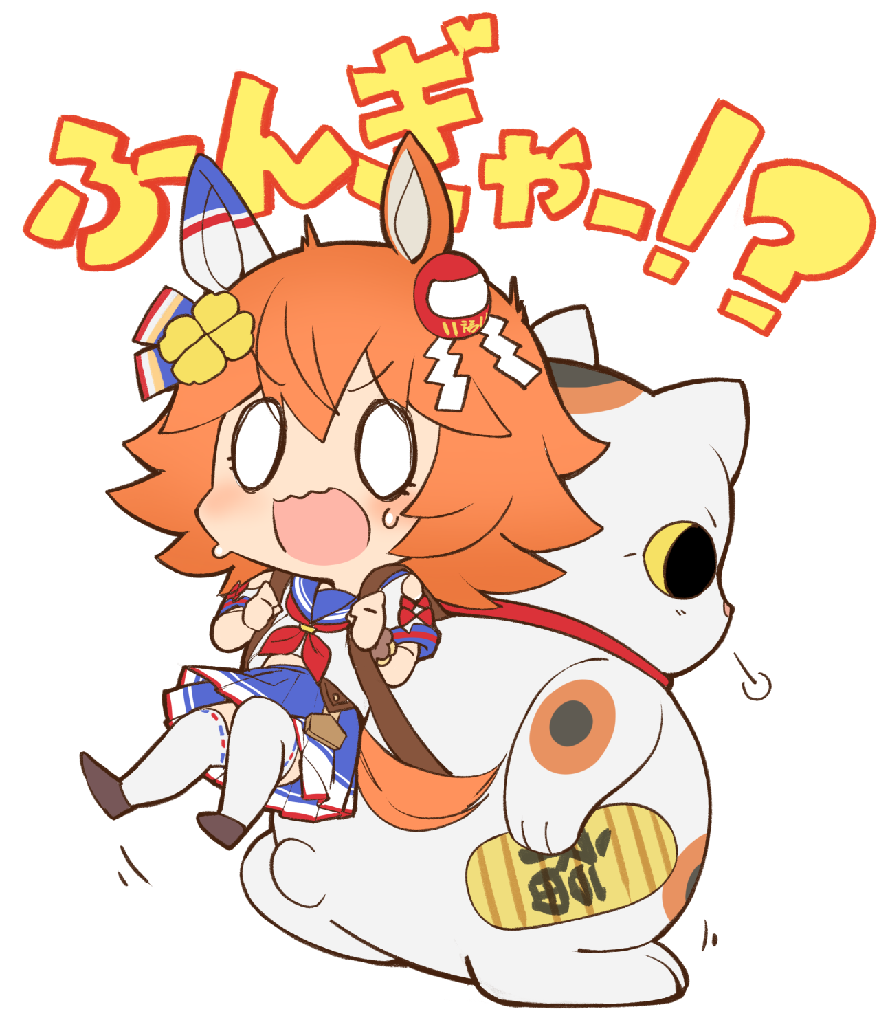 1girl alternate_eye_symbol animal_ears backpack bag bead_bracelet beads blank_eyes blush bracelet chibi clothing_cutout clover_hair_ornament coin commentary daruma_doll ema gold good_fortune_symbol hair_ornament highres holding_strap horse_ears horse_girl horse_tail jewelry koban_(gold) looking_at_viewer maneki-neko matikanefukukitaru_(umamusume) midriff_peek motion_lines neckerchief nihudau open_mouth orange_hair outstretched_arm pleated_skirt puff_of_air red_neckerchief sailor_collar school_uniform serafuku shoulder_cutout skirt smile solo strap sweat tail translation_request transparent_background umamusume v-shaped_eyebrows yellow_eyes