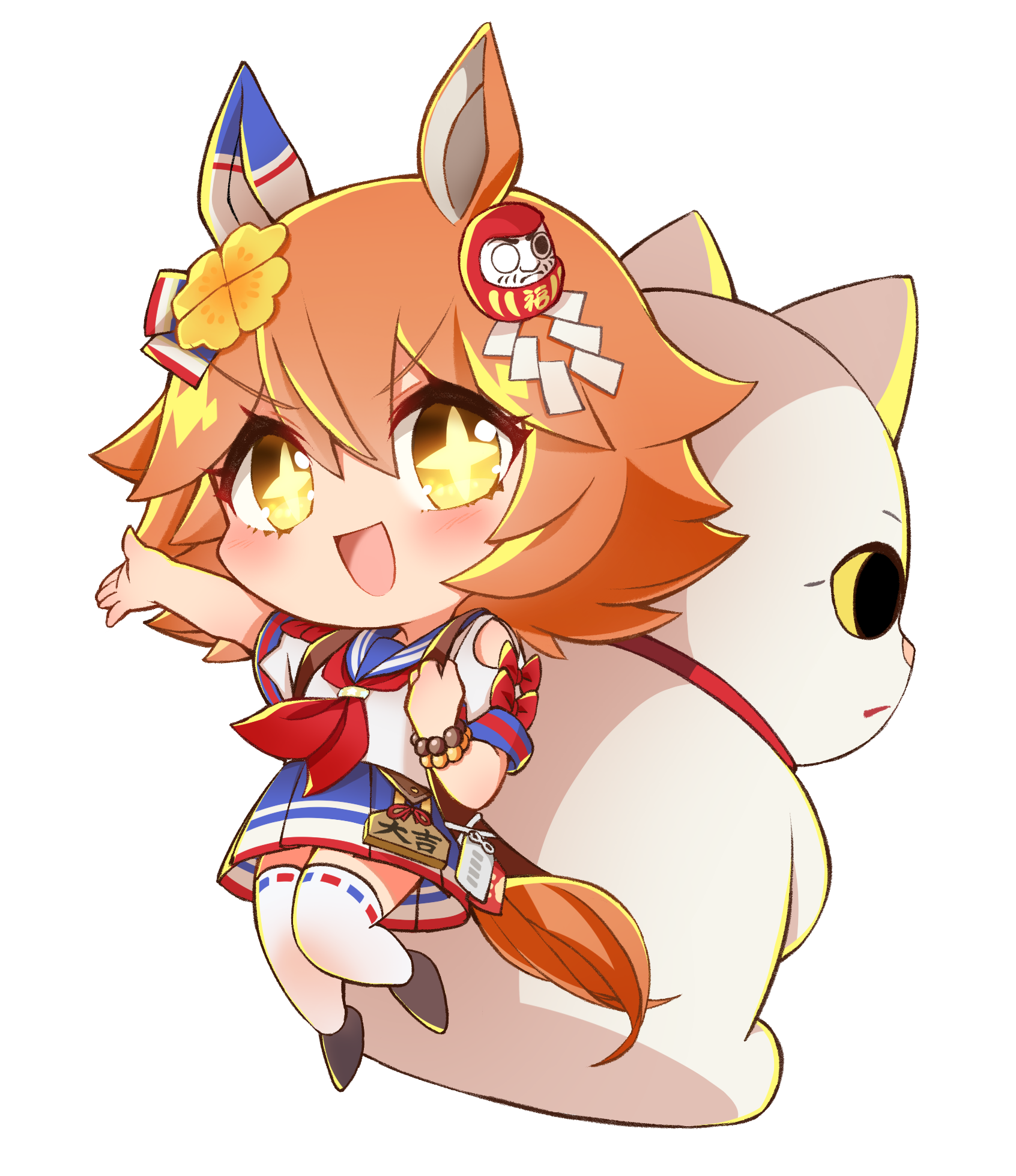 +_+ 1girl :d animal_ears backpack bag bead_bracelet beads blush bracelet chibi clothing_cutout clover_hair_ornament commentary daruma_doll ema hair_ornament highres holding_strap horse_ears horse_girl horse_tail jewelry looking_at_viewer maneki-neko matikanefukukitaru_(umamusume) neckerchief nihudau open_mouth orange_hair outstretched_arm pleated_skirt red_neckerchief sailor_collar school_uniform serafuku shoulder_cutout skirt smile solo strap tail transparent_background umamusume v-shaped_eyebrows yellow_eyes