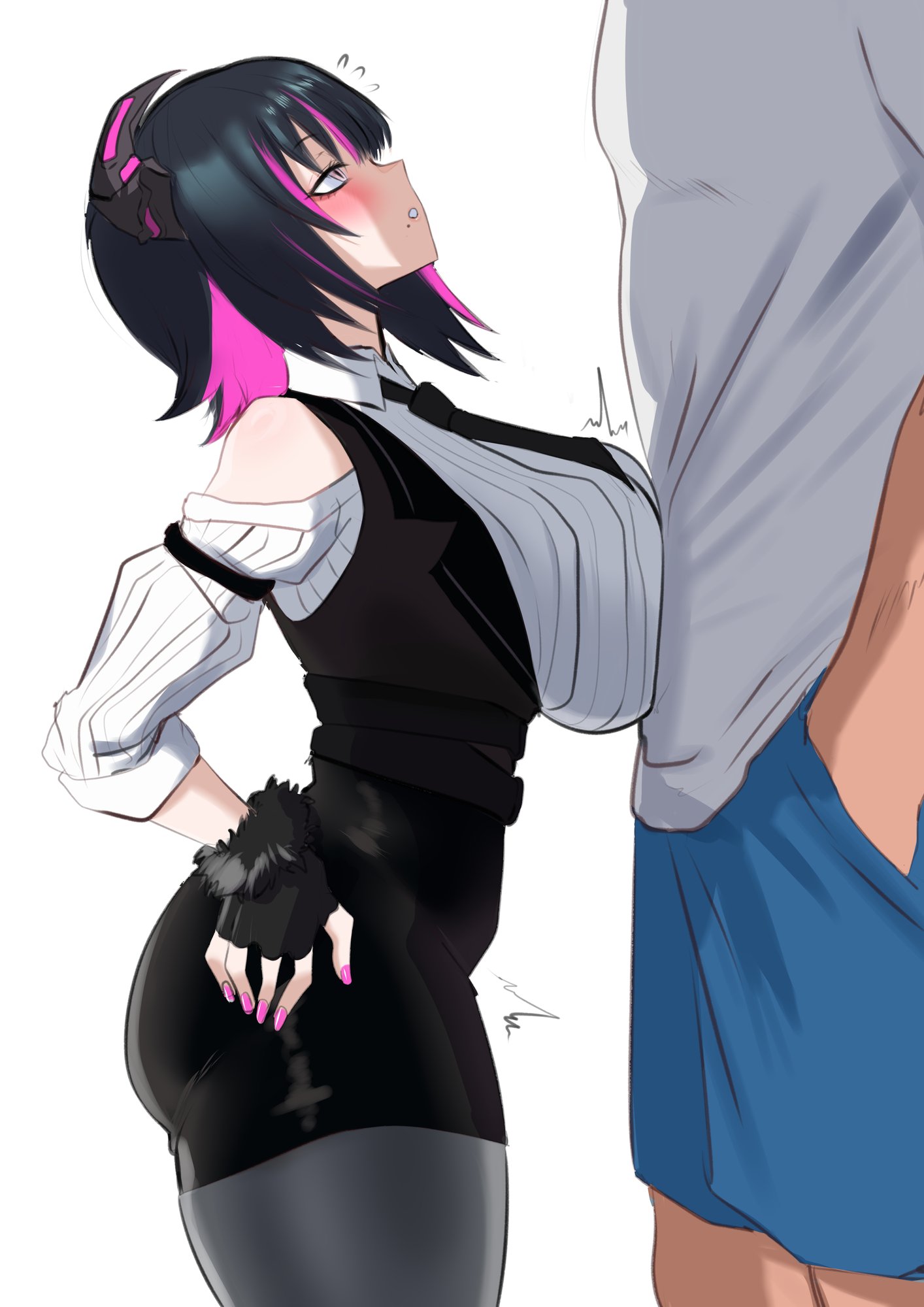 1boy 1girl aradia_ravencroft black_hair blush breast_press breasts colored_inner_hair demon_girl demon_horns flying_sweatdrops from_side fur_trim height_difference highres hololive hololive_english horns huge_breasts mole mole_under_mouth multicolored_hair nail_polish pink_hair pink_nails redi_(rasec_asdjh) short_hair simple_background skin_tight solo_focus two-tone_hair virtual_youtuber white_background womb_twitch