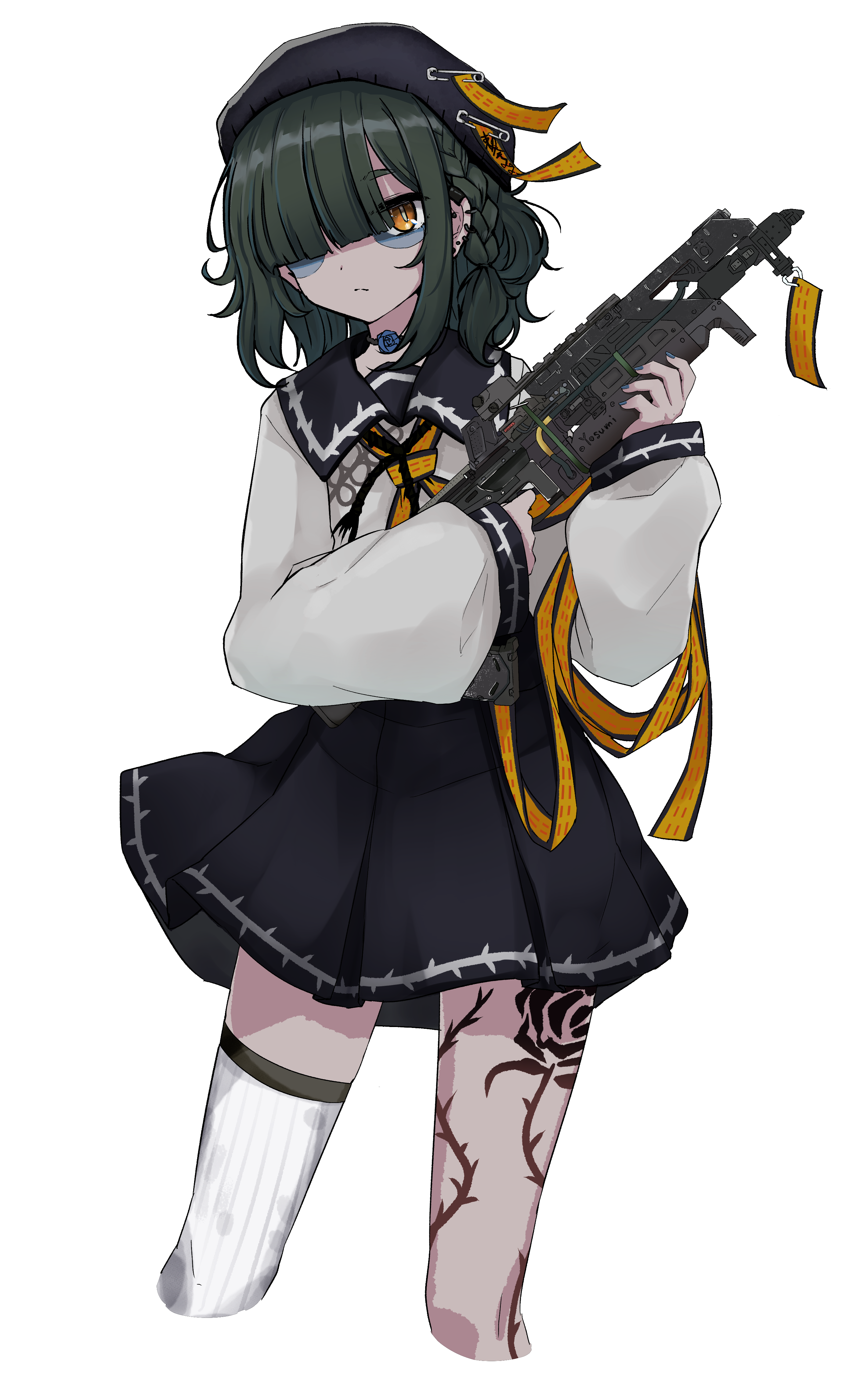 1girl absurdres bags_under_eyes beret black_hat black_sailor_collar black_skirt blue_flower blue_rose braid closed_mouth colored_skin commentary_request cropped_legs earrings flower green_hair grey_skin gun hands_up hat highres holding holding_gun holding_weapon indie_virtual_youtuber jewelry jiangshi kasa_kasa_(enkasa) leg_tattoo long_sleeves looking_at_viewer neckerchief official_alternate_costume one_eye_covered pleated_skirt puffy_long_sleeves puffy_sleeves rose sailor_collar school_uniform serafuku shirt side_braid simple_background single_thighhigh skirt solo standing tattoo thighhighs transparent_background virtual_youtuber weapon white_shirt white_thighhighs yellow_eyes yellow_neckerchief yosumi_(vtuber)