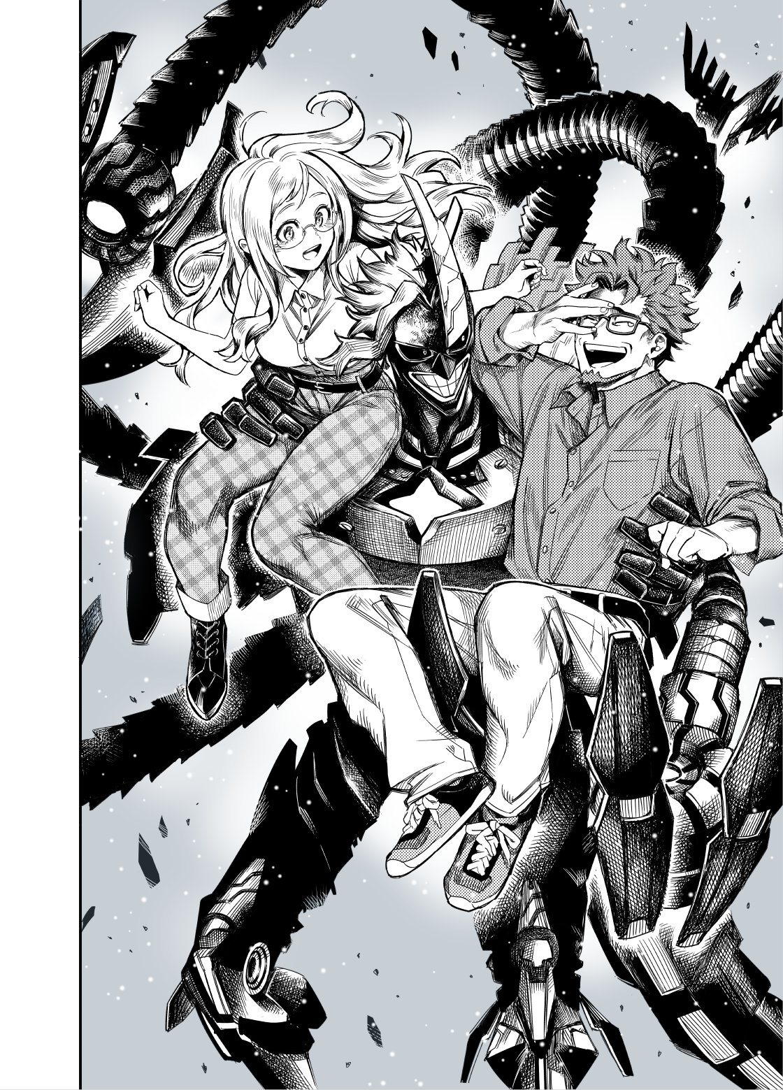1girl 2boys all_might armor beard belt belt_buckle blush boku_no_hero_academia breast_pocket buckle buttons carrying carrying_person child_carry closed_eyes clothing_request collared_shirt colored_sclera cowboy_shot crack crosshatching curly_hair david_shield debris dress_shirt facial_hair floating_hair gb0071fg grey_background greyscale grin hand_on_another's_thigh hand_on_another's_waist hand_on_own_face hands_up happy hatching_(texture) high-waist_pants highres laughing long_hair mechanical_tentacles melissa_shield monochrome multiple_boys official_alternate_costume open_collar pants plaid_clothes plaid_pants pocket power_armor rimless_eyewear round_teeth science_fiction shirt shoes short_hair short_sleeves sidelocks sitting_on_shoulder sleeves_rolled_up smile sneakers spoilers swept_bangs tearing_up tears teeth three-quarter_sleeves turning_head unmoving_pattern upper_teeth_only wing_collar yagi_toshinori