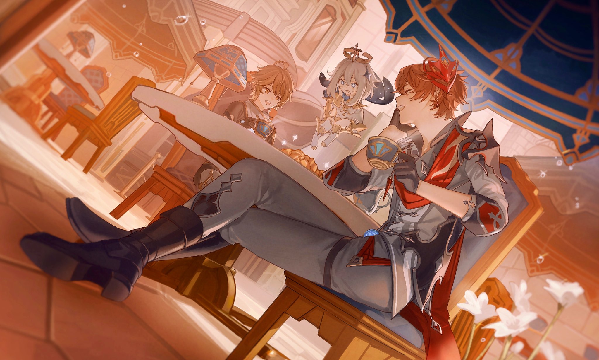 +_+ 1girl 2boys :d ^_^ aether_(genshin_impact) ahoge black_cape black_eyes black_footwear black_gloves blonde_hair blush boots brown_gloves brown_shirt building cape chair closed_eyes collared_shirt commentary_request crossed_bangs crossed_legs cup day desk_lamp dokaco_(bb_bg0) drooling dutch_angle earrings flower flying food genshin_impact gloves gold_trim grey_jacket grey_pants hair_between_eyes hair_ornament halo hand_up hands_on_own_face hands_up head_rest highres holding holding_cup jacket jewelry lamp looking_at_another mask mask_on_head medium_hair multiple_boys on_chair open_mouth orange_hair orange_theme outdoors paimon_(genshin_impact) pants popped_collar red_cape red_mask romper shade shirt short_hair short_sleeves single_thighhigh sitting sleeves_rolled_up smile sparkle star_(symbol) star_hair_ornament steam stone_floor symbol-shaped_pupils table tartaglia_(genshin_impact) teacup teeth thighhighs upper_teeth_only vision_(genshin_impact) water_drop white_flower white_footwear white_hair white_romper white_thighhighs yellow_eyes