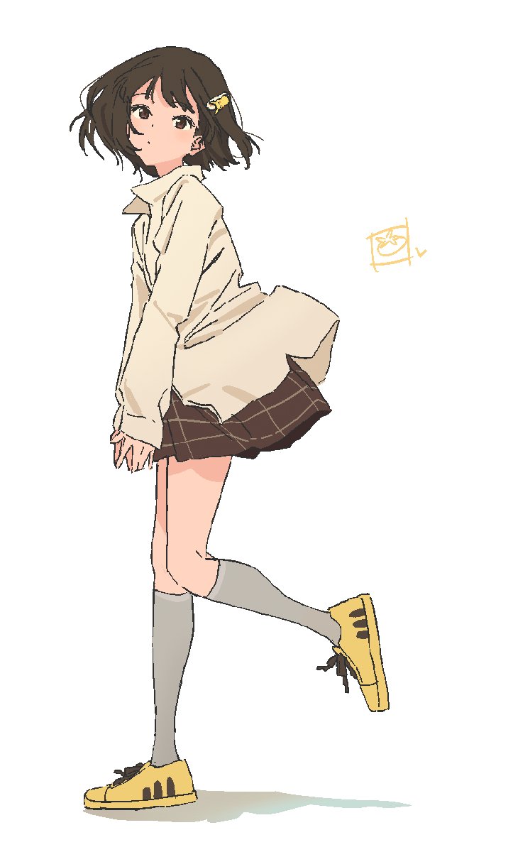 1girl artist_logo black_hair brown_eyes brown_skirt closed_mouth copyright_request dot_mouth floating_clothes full_body grey_socks hair_ornament hairclip head_tilt highres jacket kneehighs logo looking_at_viewer own_hands_together plaid_clothes plaid_skirt shadow shoes short_hair simple_background skirt socks solo standing standing_on_one_leg tomato_(lsj44867) white_background white_jacket yellow_shoes